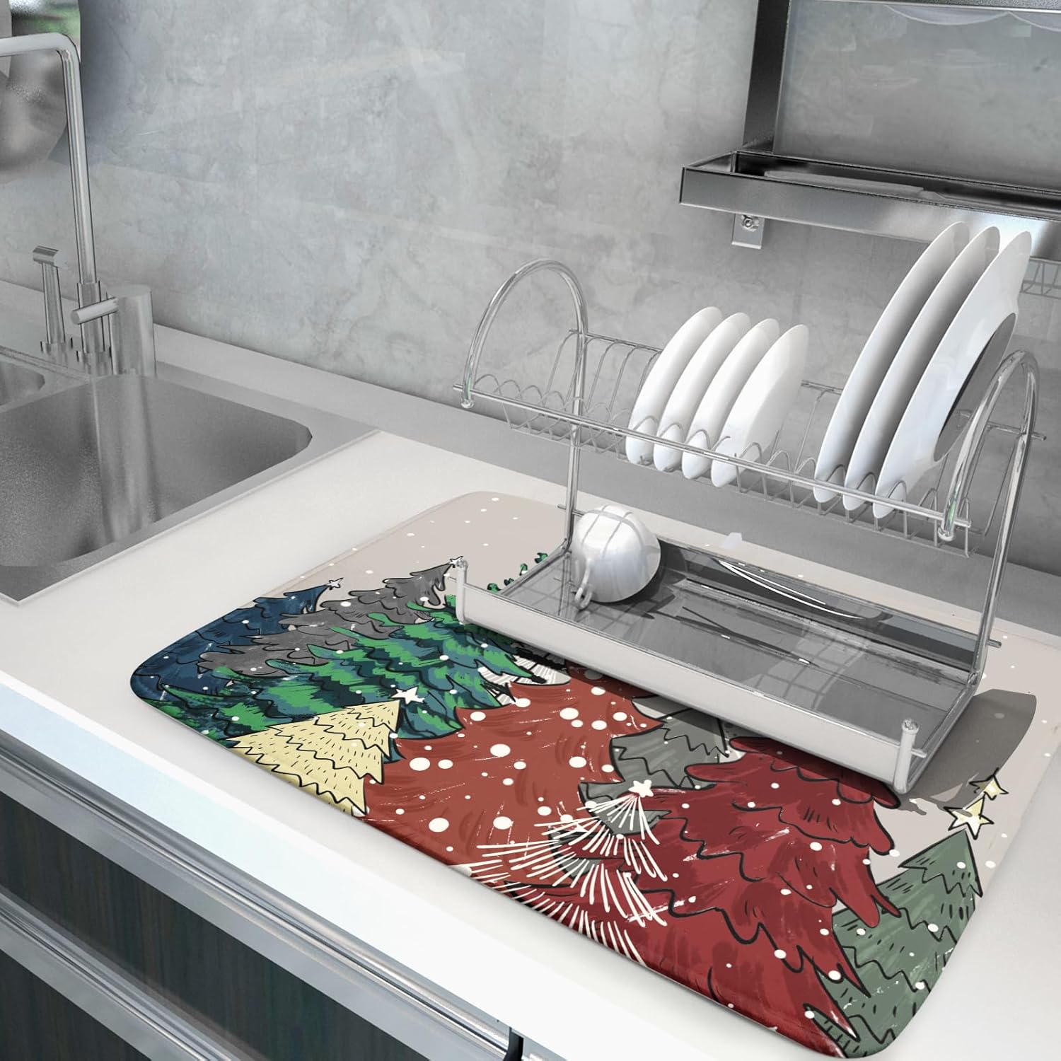 Christmas Trees Dish Drying Mat Winter Holiday Kitchen Dishes Pad 18x24 Inch Absorbent Reversible Fast Dry Draining Rack Pad for Countertop