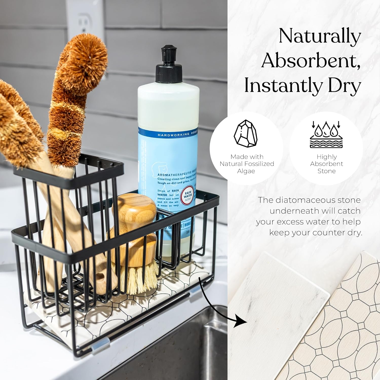 - Kitchen Storage & Countertop Caddy: Maximize space with this kitchen sink caddy that includes a diatomaceous stone tray to absorb excess water. A reliable dish soap organizer for kitchen sinks, ensuring sponges and brushes dry quickly.