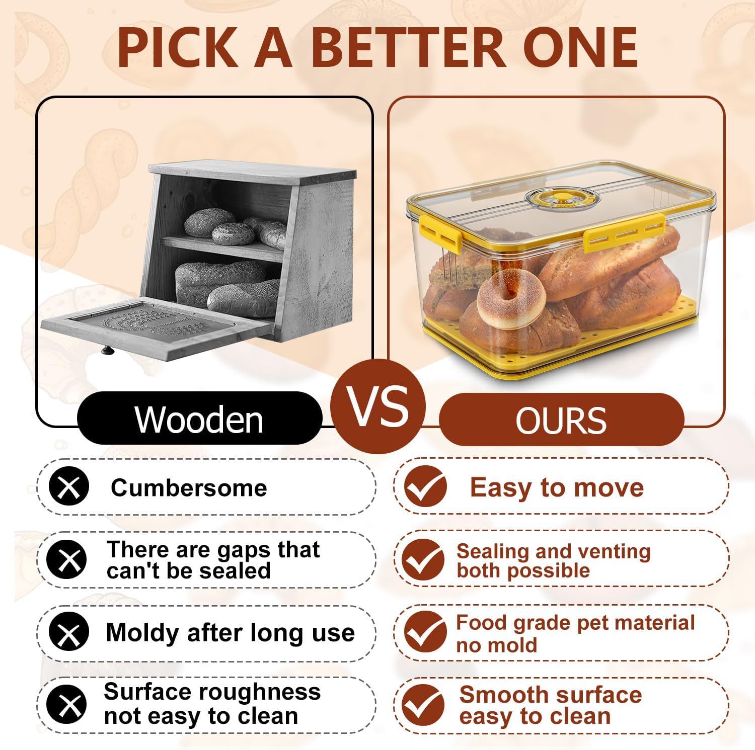 - Why choose our bread box: Compared with the long strip shape bread container,our bread storage box is wide and suitable for putting different shapes of bread.Compared to the wooden breadbox,our bread storage container is easy to clean and the material of the bread keeper box will not get moldy after years.Our bread bin is sealed for resistant to moisture.Have an air valve on the bread box lid,optionally release hot bread airflow or seal against moisture