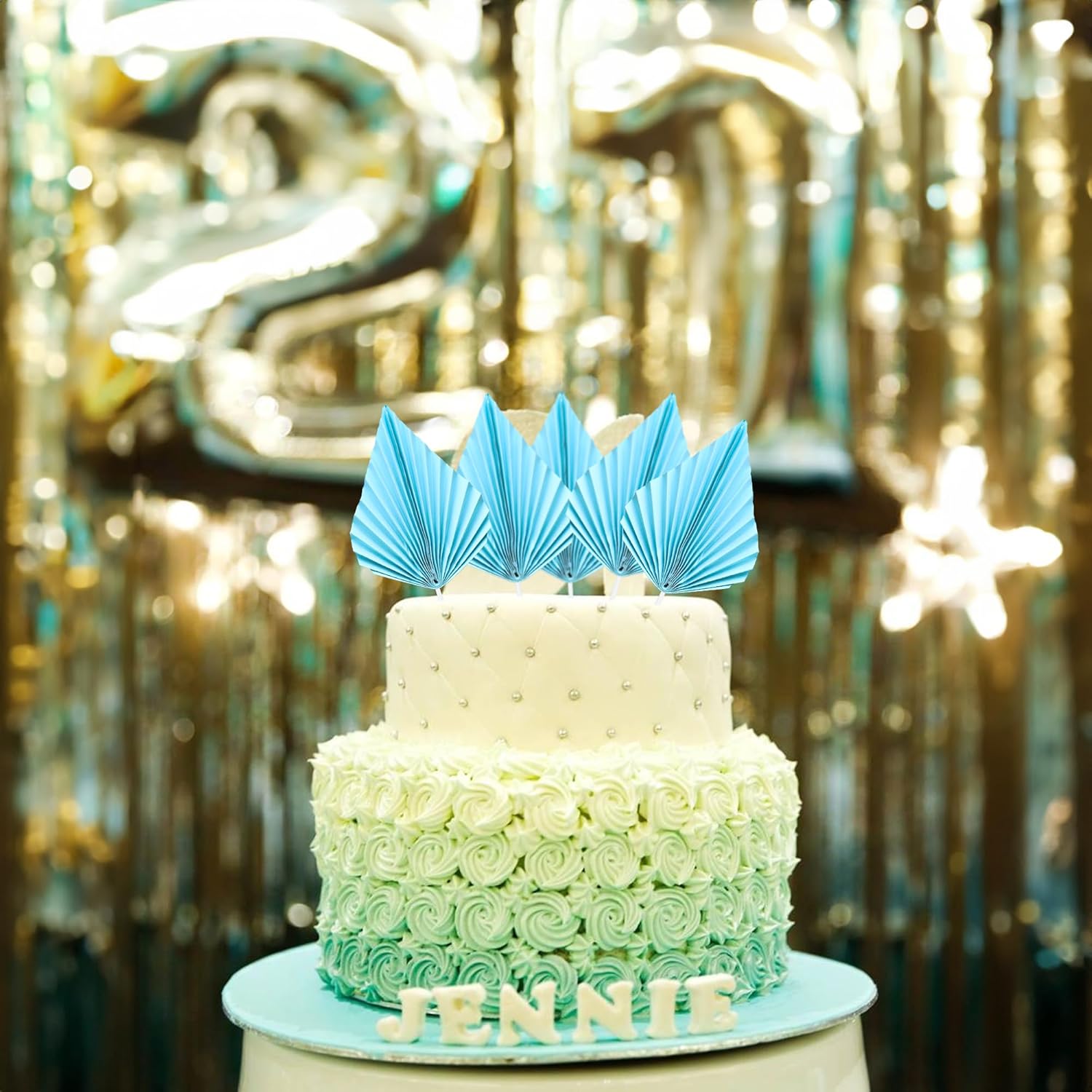 Gyufise 6pcs Paper Palm Fan Cake Toppers - Palm Leaf Fan & Spear Leaf Cupcake Toppers - Cake Insert Decoration for DIY Craft Projects, Home, Wedding, Party Supplies - Lake Blue