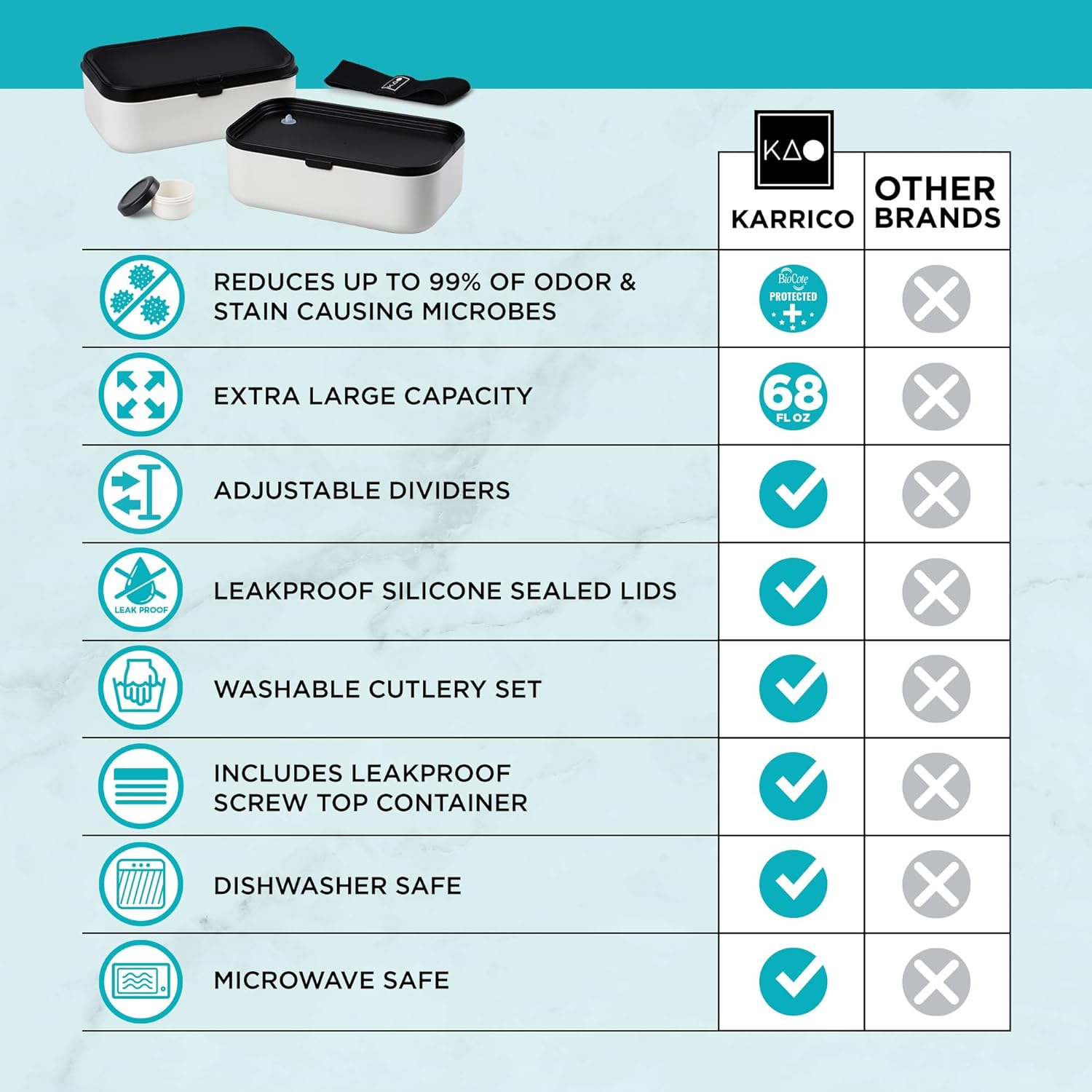 - BIOCOTE PRODUCT PROTECTION - Food leaving a lingering smell in your lunchbox is always a worry. The BPA free, leakproof and food contact safe surfaces of KARRICO bento boxes have BioCote technology that helps protect against stains and bad odors. *BioCote technology does not protect users or others against disease-causing germs, and other harmful organisms. This technology is not a substitute for good hygiene and/or cleaning practices.
