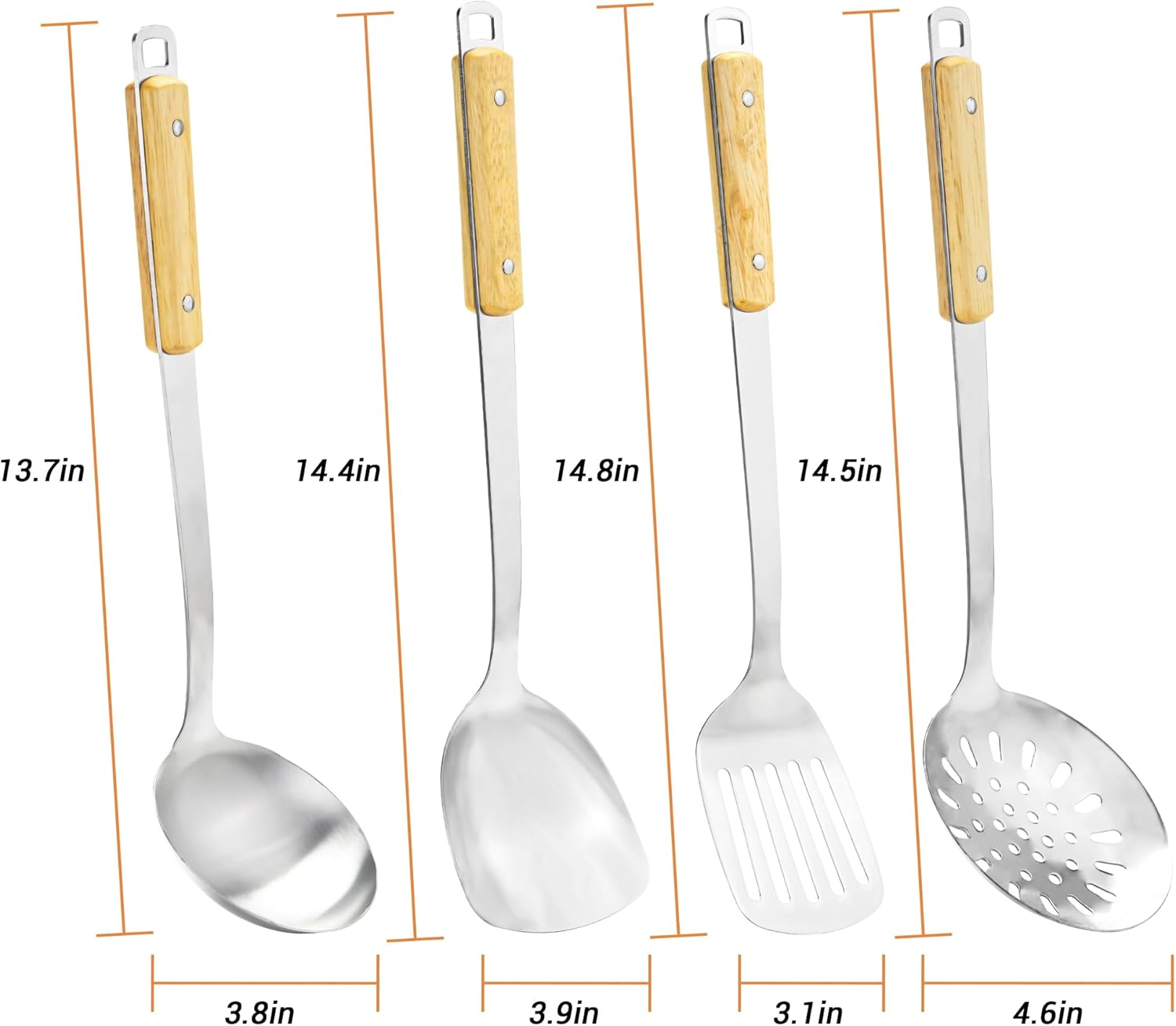 FJNATINH Cooking Utensils - Spatula, Ladle, Skimmer Spoon, Slotted Spatula - 4 Pieces Stainless Steel Wok Utensils Set for Carbon Steel