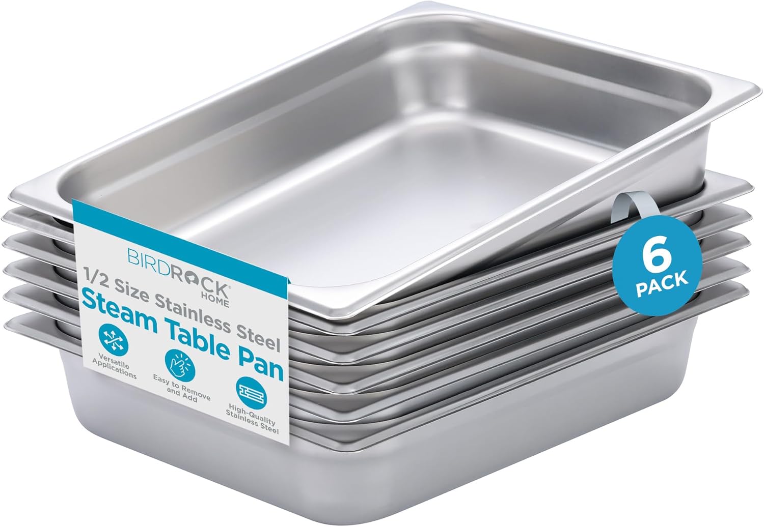 BIRDROCK HOME Stainless Steel Steam Table Pan - Hotel, Restaurant & Catering Supplies - 24 Gauge Steel, 4.5 qt Capacity - Meal Prep, Cooking, & Food Storage Container - 2.5" Depth, 1/2-Size (6 Pack)