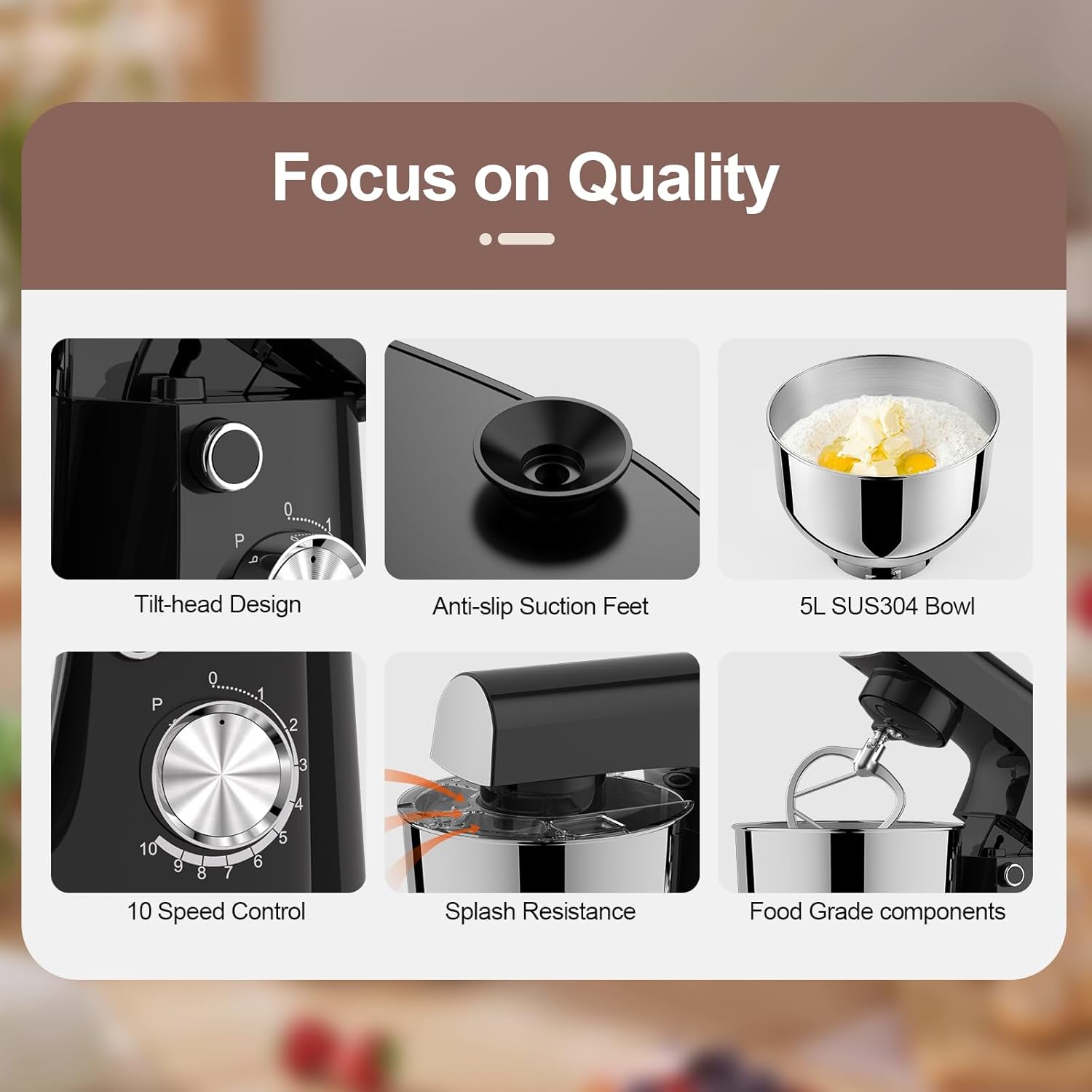 Stand Mixer, 5.5 Quart, 10 Speed Tilt-Head Food Mixer, Kitchen Electric Mixer with SS Bowl, Copper Motor, Beater, Dough Hook, SS Egg Whisk (300W Black)