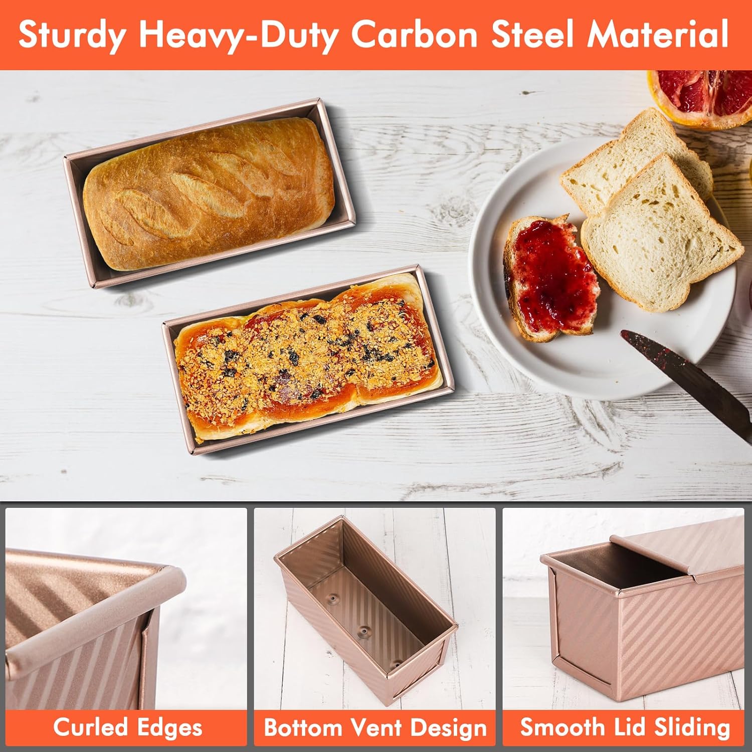 Beasea Pullman Loaf Pan With Lid, 2 Pack 0.5 lb Small Non-Stick Carbon Steel Mini Toast Box for Homemade Bread Oven Baking - Rose Gold