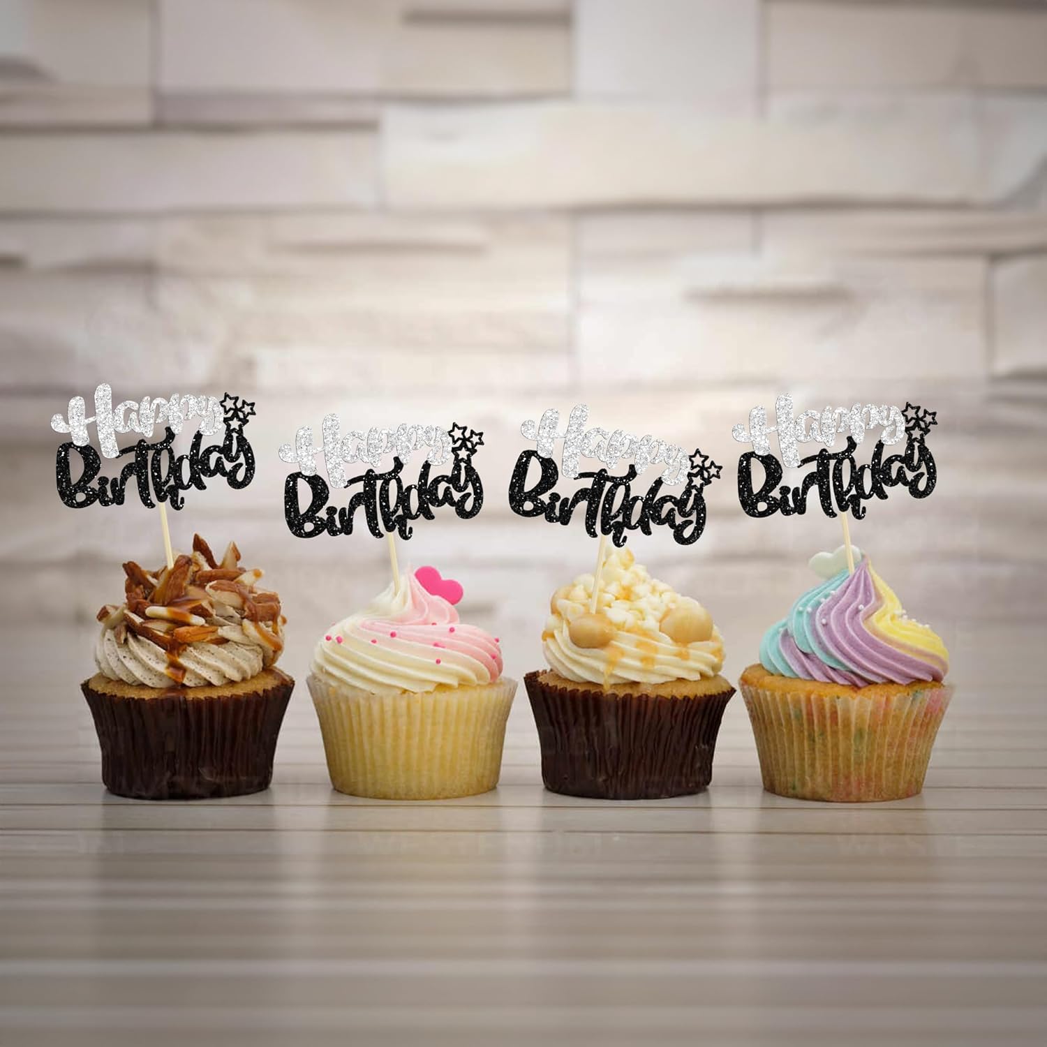 Ephlyn 24Pcs Happy Birthday Cupcake Toppers - Black Silver Glitter - Double Layer - Perfect for Birthday, Baby Shower & Anniversary Parties