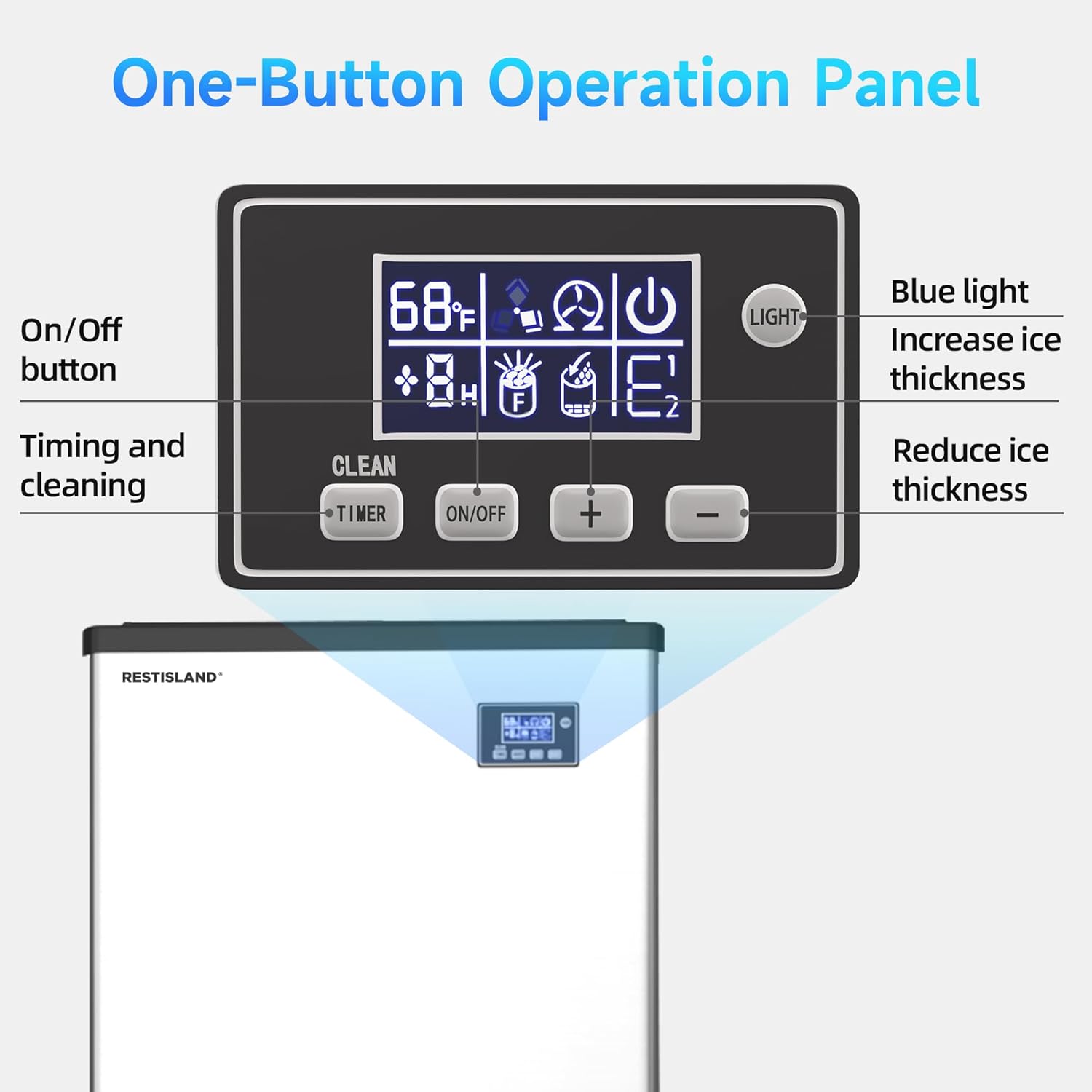 - Smart LCD Panel: You can preset and monitor the process of ice making easily, the thickness of ice cubes can be adjusted by increasing or decreasing ice-making time, blue Light and automatic cleaning function make it easier to observe the ice tray and ensure the hygiene of the ice tray.