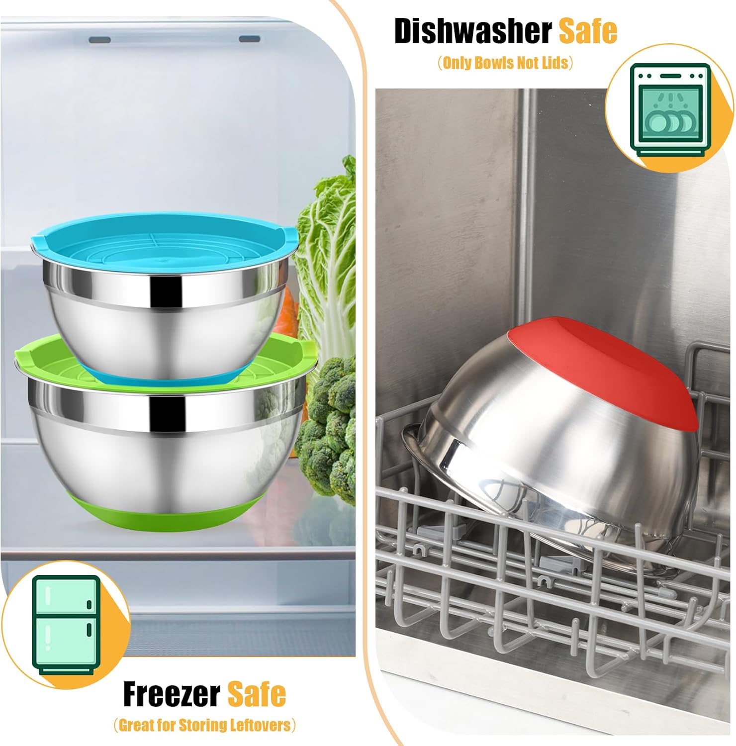 - 【Thoughtful Design】The mixing bowls with colorful lids set is specially lightweight to save your effort when you need to transport bowl with full food, Airtight lids could close snugly on the bowl to create an airtight storage container, And keep your food fresh to avoid food spills or leaks, Silicone bottom increases friction with the table, To help you focus on mixing and whisking without worrying about the bowl sliding unexpectedly and producing annoying noise, Smooth rolled edges of the bowl without any rough burrs for comfortable grip