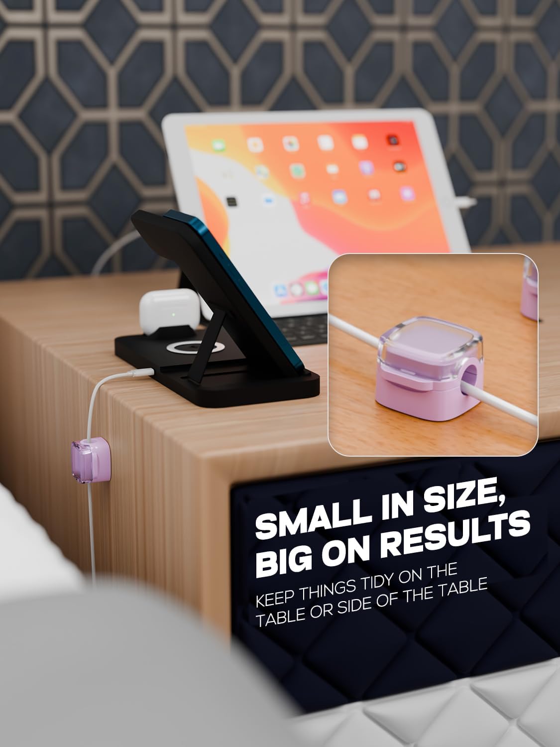 6-Pack Magnetic Cord Holder, Cord Holder with Strong Magnetic Lid, Holds Cables Firmly, 7 mm Charger Holder & HDMI Cord Organizer Clips, Strong Adhesive Pad (Purple)