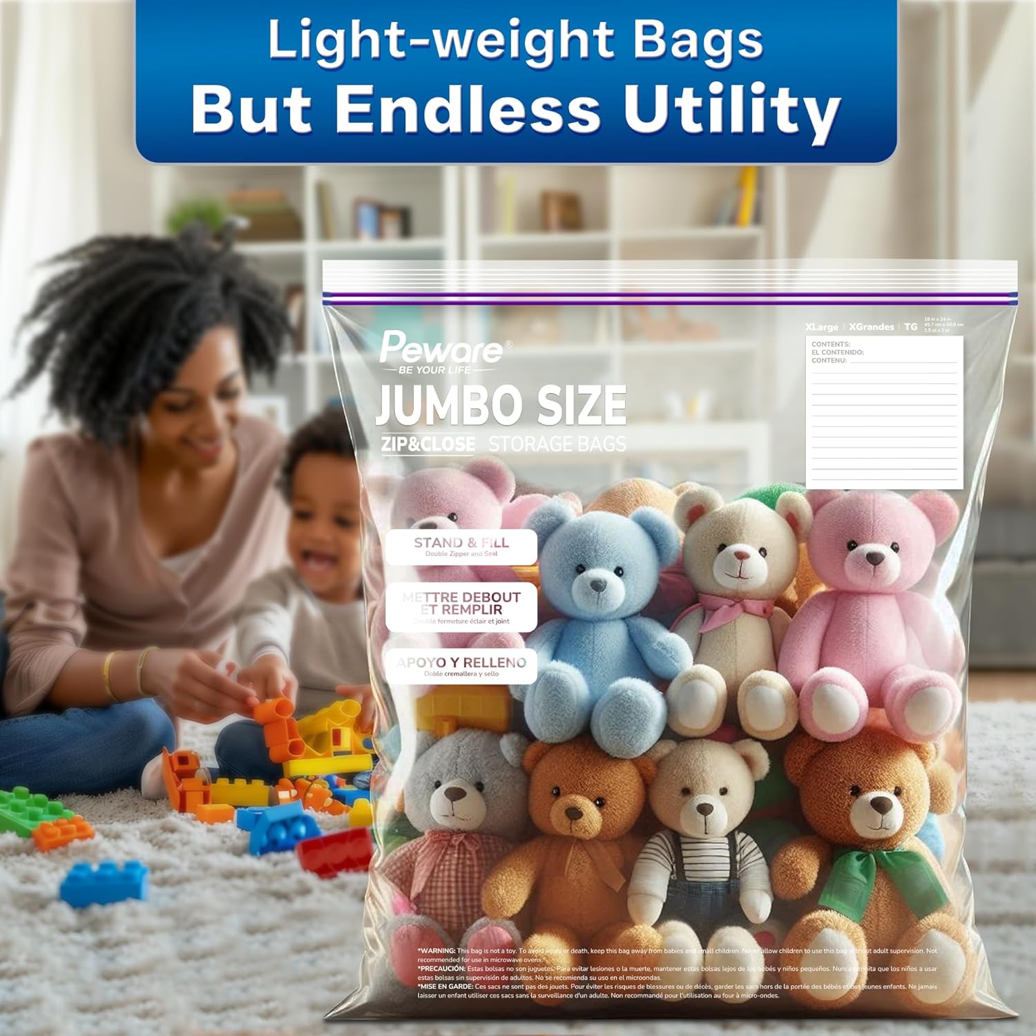 Large Storage Bags, 16"x20" Jumbo Plastic Bag, BPA Free, 3.5 Gallon XL Zipper Lock Baggies for Clothes Pillow Travel Moving - 15 Roomy Bags