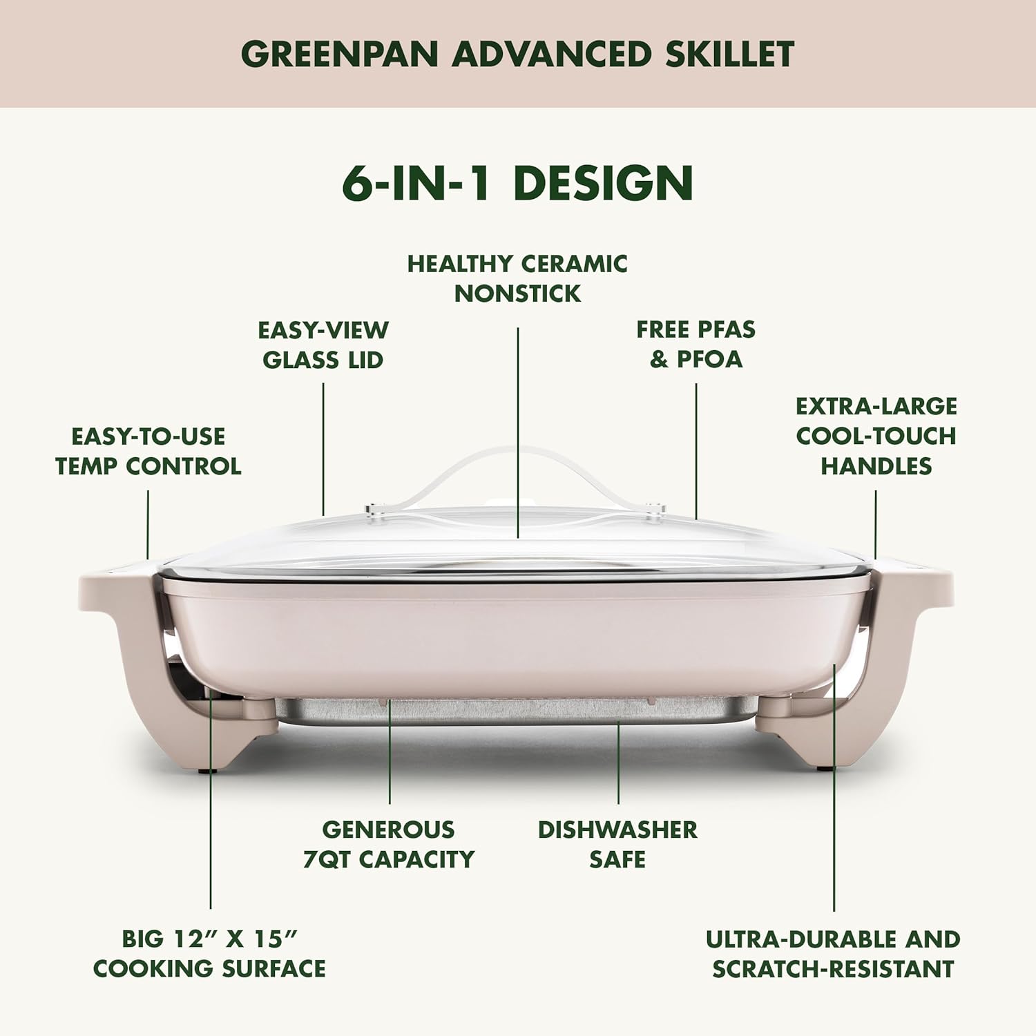 GreenPan Advanced 12” X 15” Electric Skillet with Lid, 7QT Capacity for Family Meals, Healthy Ceramic Nonstick PFAS-Free Coating, Fry, Sauté, Steam, Simmer, Sear, Stir Fry, Dishwasher Safe, Clay