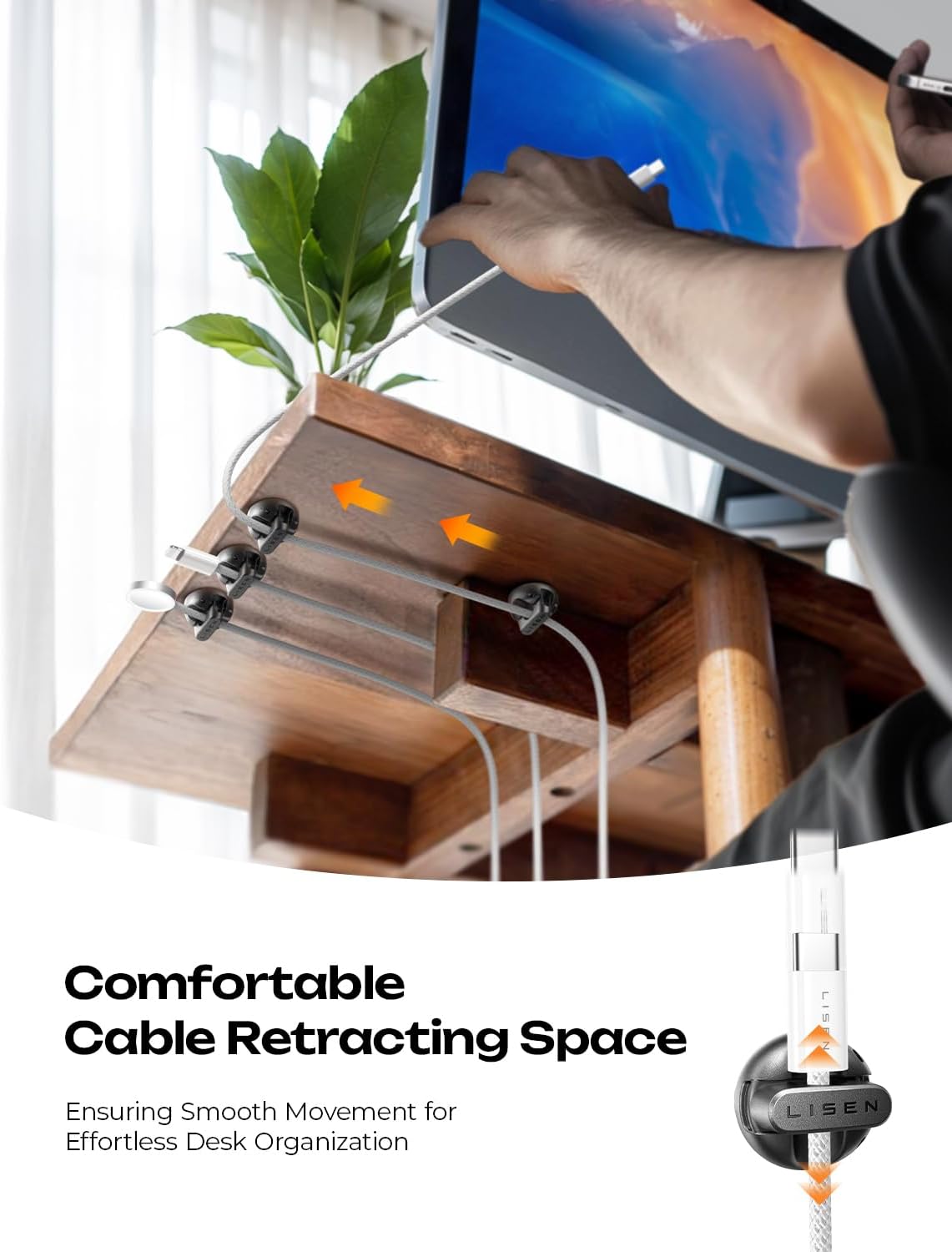 - Quick Install Wire Management – Simply peel, stick, and press for 30 seconds. This desk wire organizer makes cable setup fast and clean — no tools, no mess.