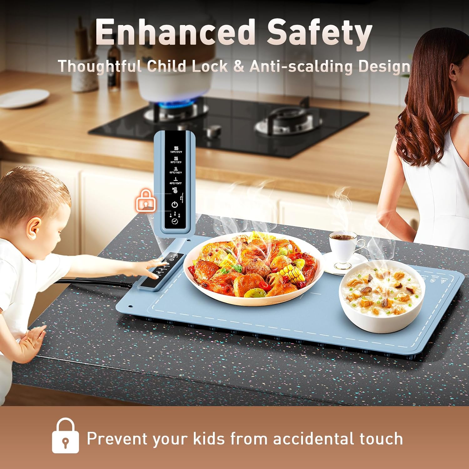 - 【Enhanced Safety with Child Lock & Anti-Scalding】Our silicone warming mat for food extra large is designed with more safety details in mind, which equipped with a thoughtful child safety lock and anti-scalding design, prevent your kids from accidentally touching and ensures that the food warmer mat operates safely around your family - a delightful dining experience for you and your loved ones.