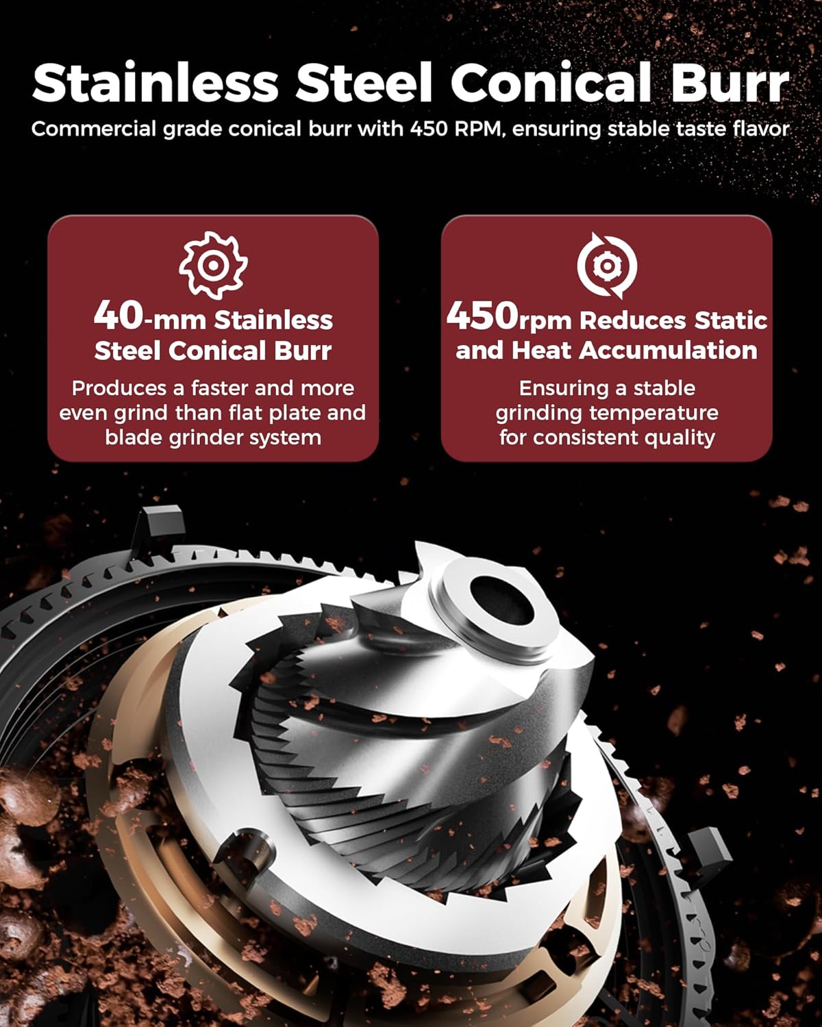 - [Patented Anti-Static 40mm Conical Burr] - This grinder's patented conical burr system delivers precise, consistent grinds for espresso, drip, or french press. The low grinding speed of 450 RPM minimizes static and heat buildup, ensuring a stable temperature for consistently excellent coffee.