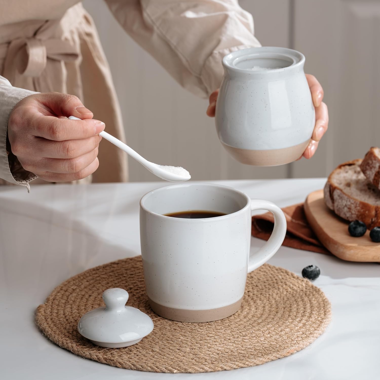 - Thoughtful Design: This sugar bowl comes with a snug-fitting lid and a handy mini spoon. The lid keeps sugar fresh and dust-free, while the spoon ensures precise portions without messy hands. Plus, the built-in spoon rest keeps everything tidy, and the wide-mouth design makes filling and scooping effortless.