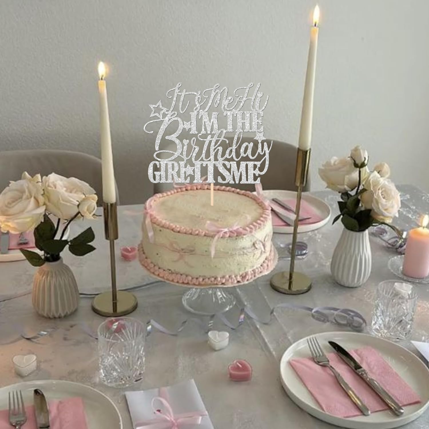 1 PCS It's Me Hi I'm the Birthday Girl It's Me Cake Topper Glitter Music Singer Cake Pick for Funny Hip Hop Singer Girls Birthday Party Cake Decorations Supplies Silver