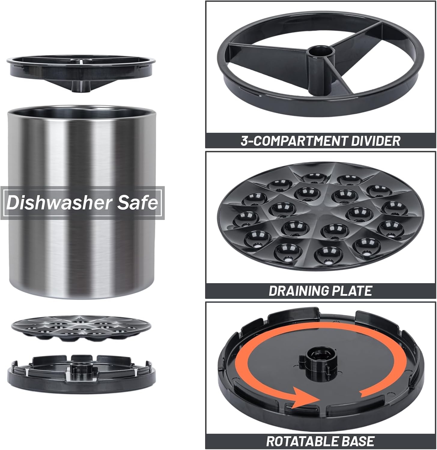 - Extra large and dishwasher safe. All plastic parts: 3-compartment divider, rotating base and draining plate are removable and durable. Take the cooking utensil holder apart and do the cleaning. Please wash the utensil crock thoroughly before first use