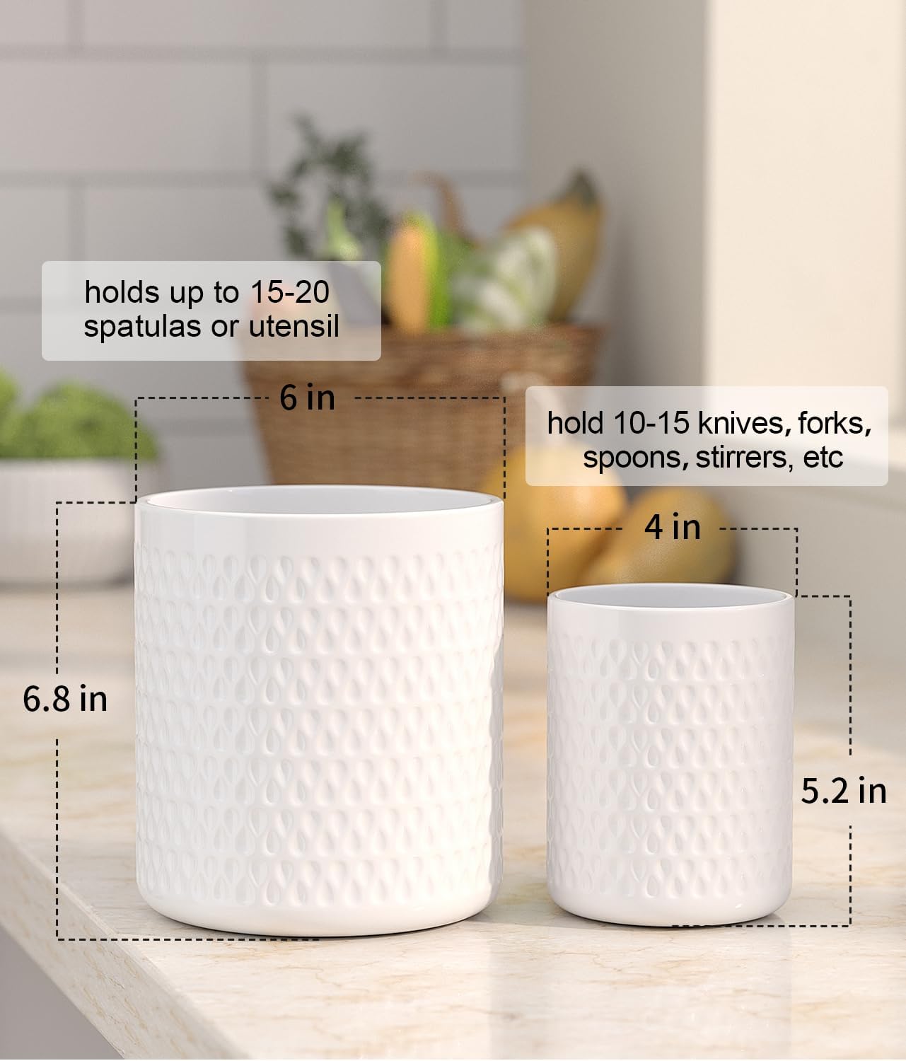 - 【Ceramic Utensil Holder Set Of 2】: This kitchen utensil holder set includes two utensil caddy, the larger size is 6" W x 6.8" H and holds up to 15-20 spatulas or utensil. The smaller size is 4" W x 5.2"H is ideal for holding smaller whisks and small spatulas, hold 5-12 knives, forks, spoons, stirrers, whisks, etc