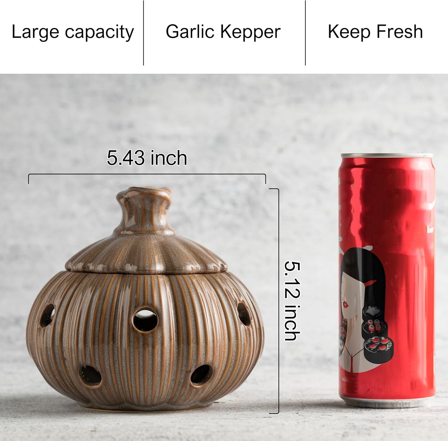 - Large Capacity: This garlic holder measures 5.43"L x 5.12"H, and can easily hold multiple normal-sized garlic bulbs, it is the first choice for garlic lovers. Not only can it store garlic, but also onions or ginger, very practical