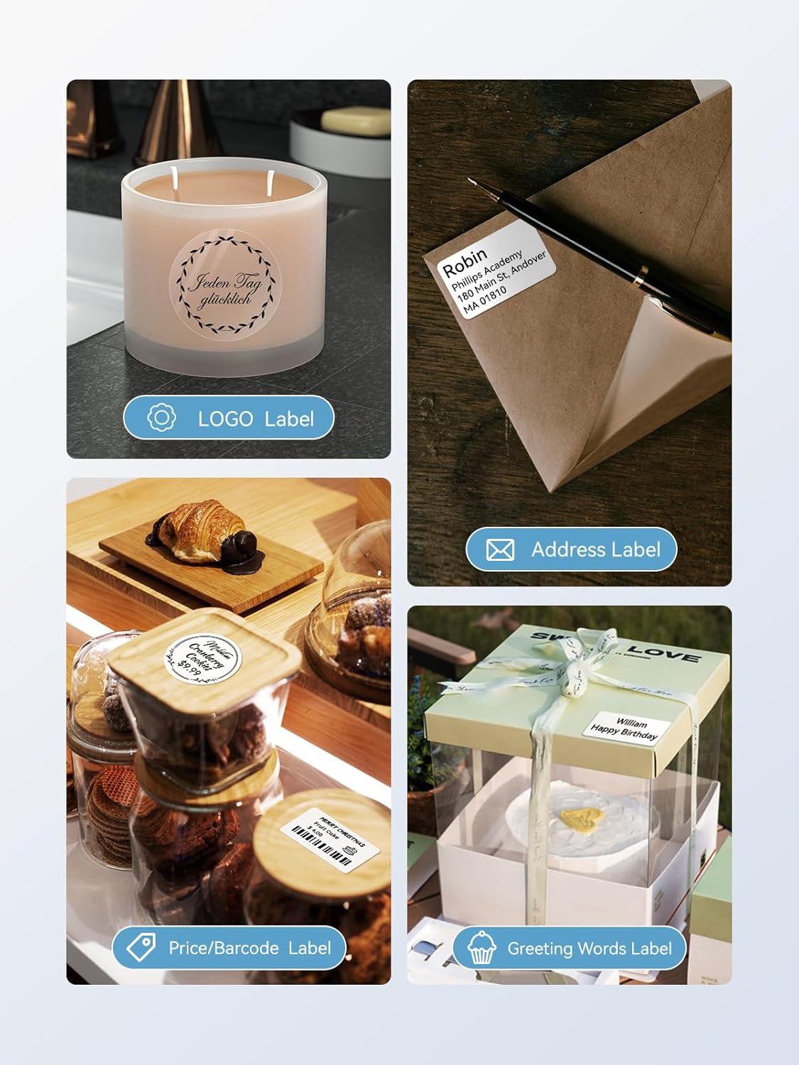 - Widely Used: This Bluetooth label maker supports label widths from 20 to 50mm, making it suitable for various uses. At home, it helps organize kitchen jars, bottles, storage containers, homemade food, and addresses. For small businesses, it’s ideal for printing price tags, product details, QR codes, barcodes and brand logos. In schools, it can be used for name tags, teacher feedback labels, clothing labels, and cup labels.Meanwhile, it is also an excellent choice for gifts.
