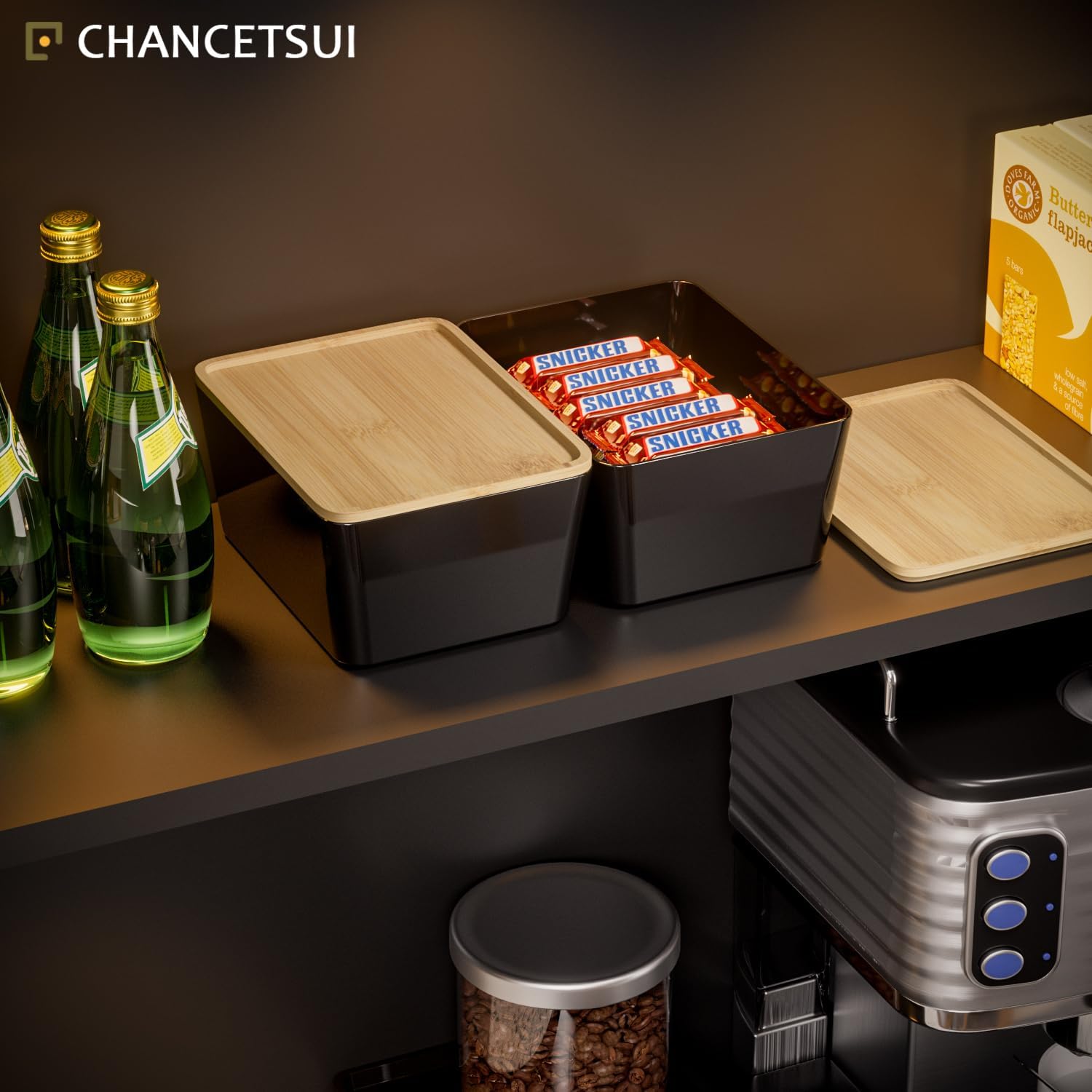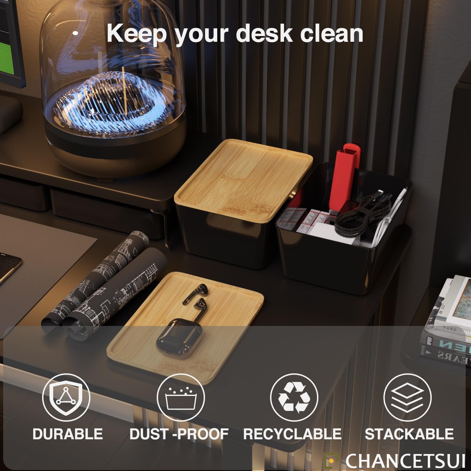 CHANCETSUI Stackable Storage Bins lids For Workplace: 5X7 Black Storage bins, Office Desk Accessories Storage Containers with Lids, Stackable Bins for Home and Office Organization, bamboo Lid, 2 Pack