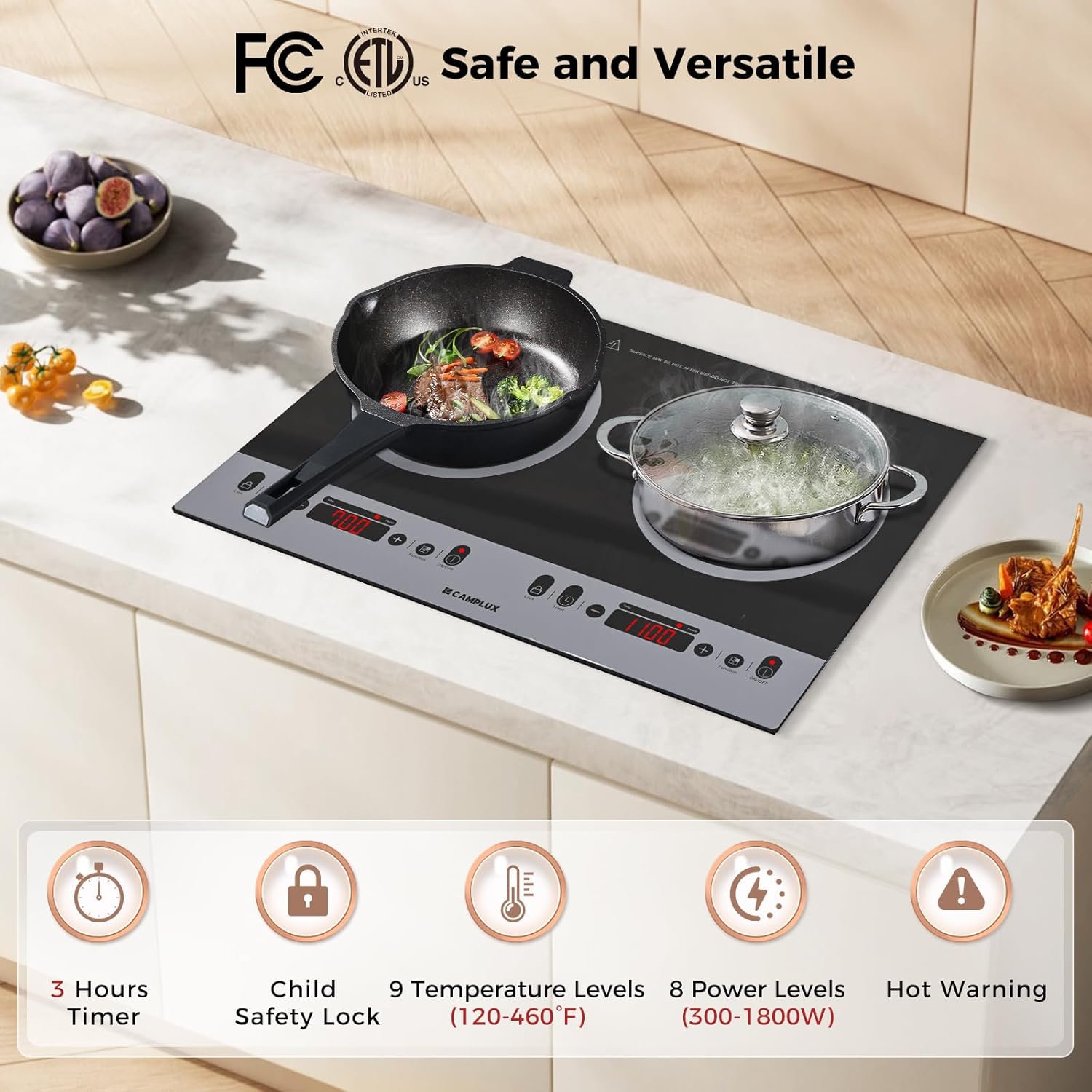 CAMPLUX RV Induction Cooktop 2 Burners 1800W, Electric Cooktop 120V Plug in, Portable Induction Stove with Sensor Touch, Timer, Safety Lock, Countertop/Built-in for RV, Mini Kitchen or Apartments