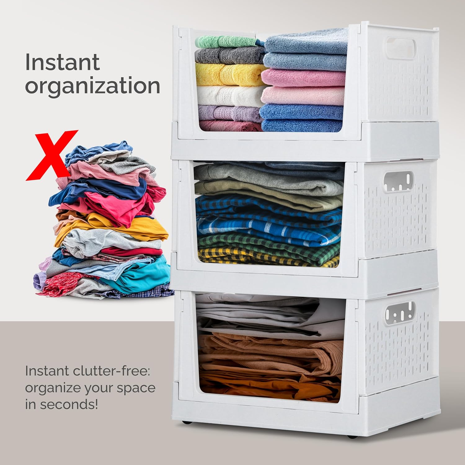- [Effortless Mobility:] Move your storage bins with ease, thanks to the 360° rotating wheels. The side carrying handles allow for convenient lifting, making it easy to transport your bins wherever they’re needed, whether you’re rearranging your closet or cleaning up your space.