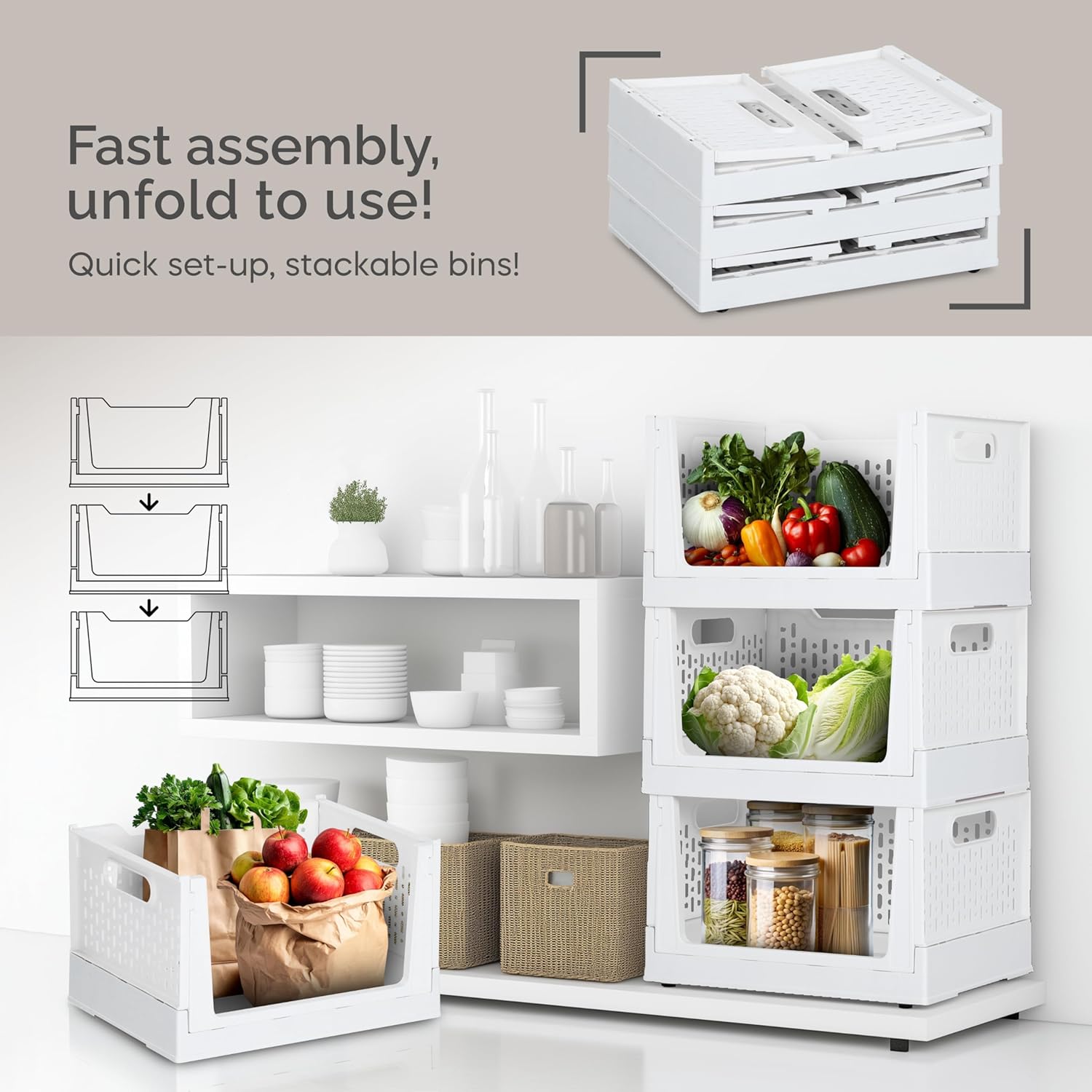 - [Space-Saving Design]: Optimize your storage space with stackable and foldable bins. When not in use, simply fold them down to free up space. The generous size accommodates a variety of items, and the snap design on both sides prevents tipping, ensuring your stacked bins stay securely in place.