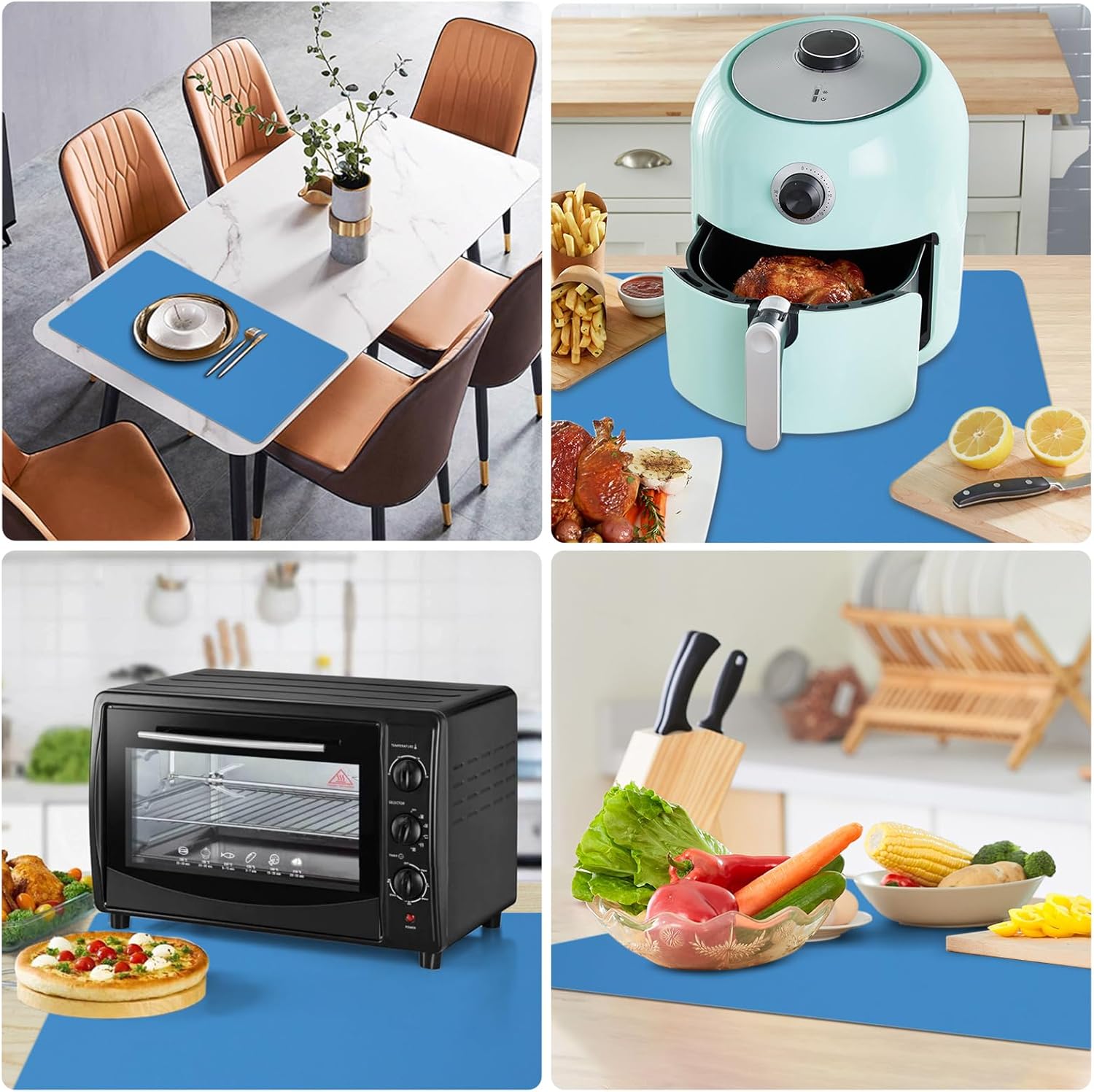 - Extra large silicone mat: Size of 48” x 24”, almost can fit most kitchen countertops, dining tables and other workbench. It can be placed under the air fryer, microwave, toaster oven, induction stove, coffee maker to protect the kitchen countertops and other surfaces against spills, scratches, grease, heat, etc. It’s cuttable to fit different sizes and shapes.