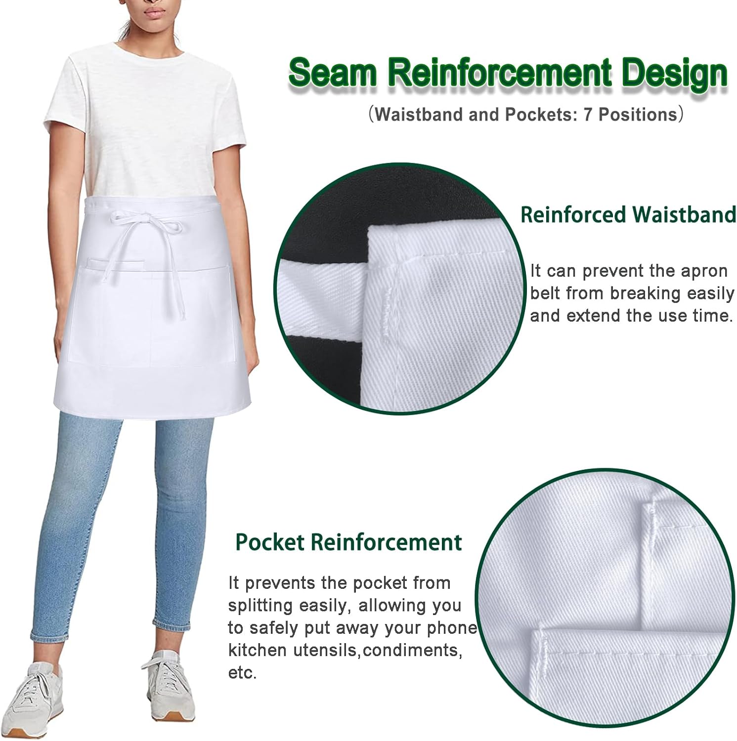 - Excellent Material - The white servers apron size is L, 15.75'' L * 27.56'' W, made of high quality 20% cotton 80% polyester, thicker and comfortable. Short apron suitable for cleaning, serving, cooking, baking, gardening