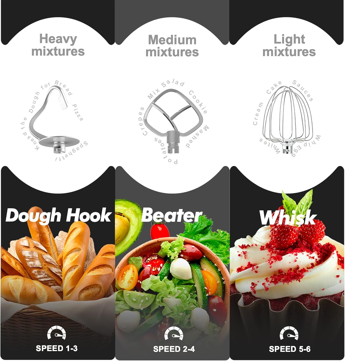 - Multiple Accessories: This electric mixer is fully equipped with accessories, including a dough hook; beater; wire whip,upgraded metal accessories can be directly loaded into the dishwasher,and has a splash-proof cover for the filling port to keep the kitchen clean