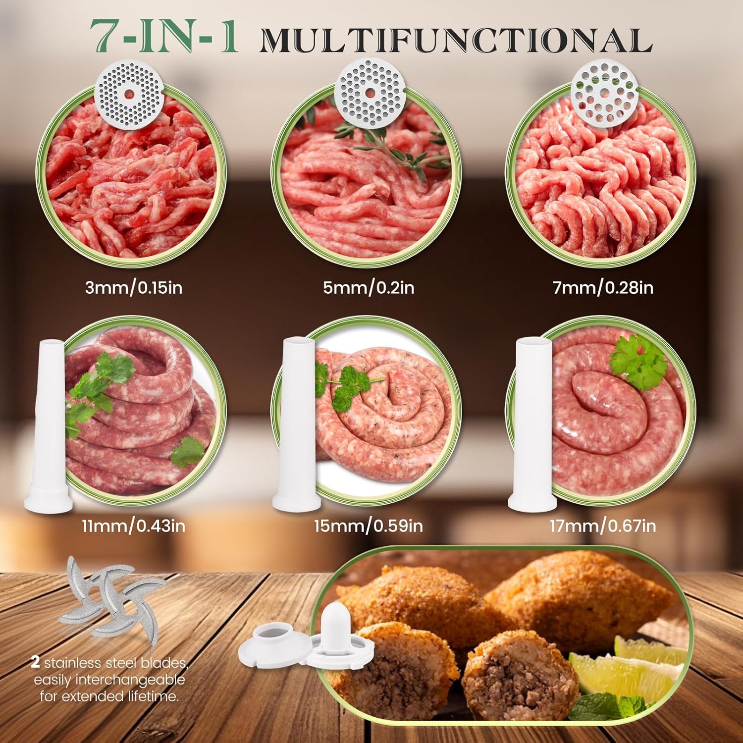 - [Versatile meat grinder] This grinder comes with three stainless steel plates (3mm, 5mm, 7mm) for adjustable textures, plus a sausage tube kit and Kubbe kit for making homemade sausages and Kubbe. Equipped with two stainless steel cross blades for added durability and long-term use