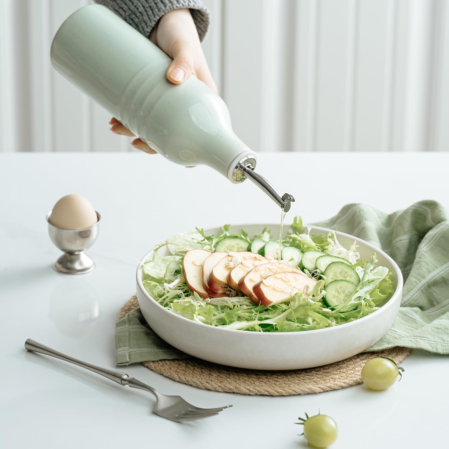 famiware Jupiter 16oz Ceramic Olive Oil Dispenser Bottle, Olive Oil and Vinegar Dispenser Bottle Set of 2 with Stainless Steel Pourers, Suitable for Storage Vinegar, Liquids, Light Green