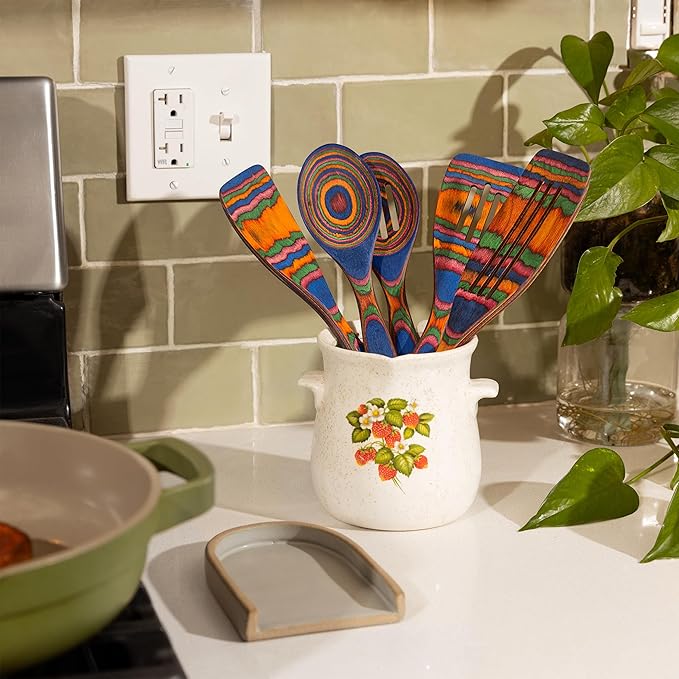 - Durable Utensil Set - This 5-piece pakkawood wooden kitchen utensil set includes colorful 12-inch tools designed for durability. Perfect for mixing, flipping, and serving, these cooking utensils set wooden bring functionality and style to your kitchen.