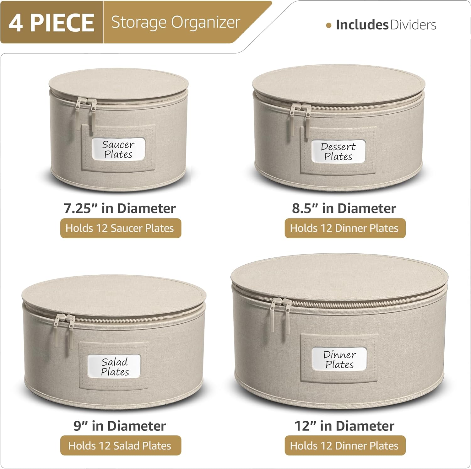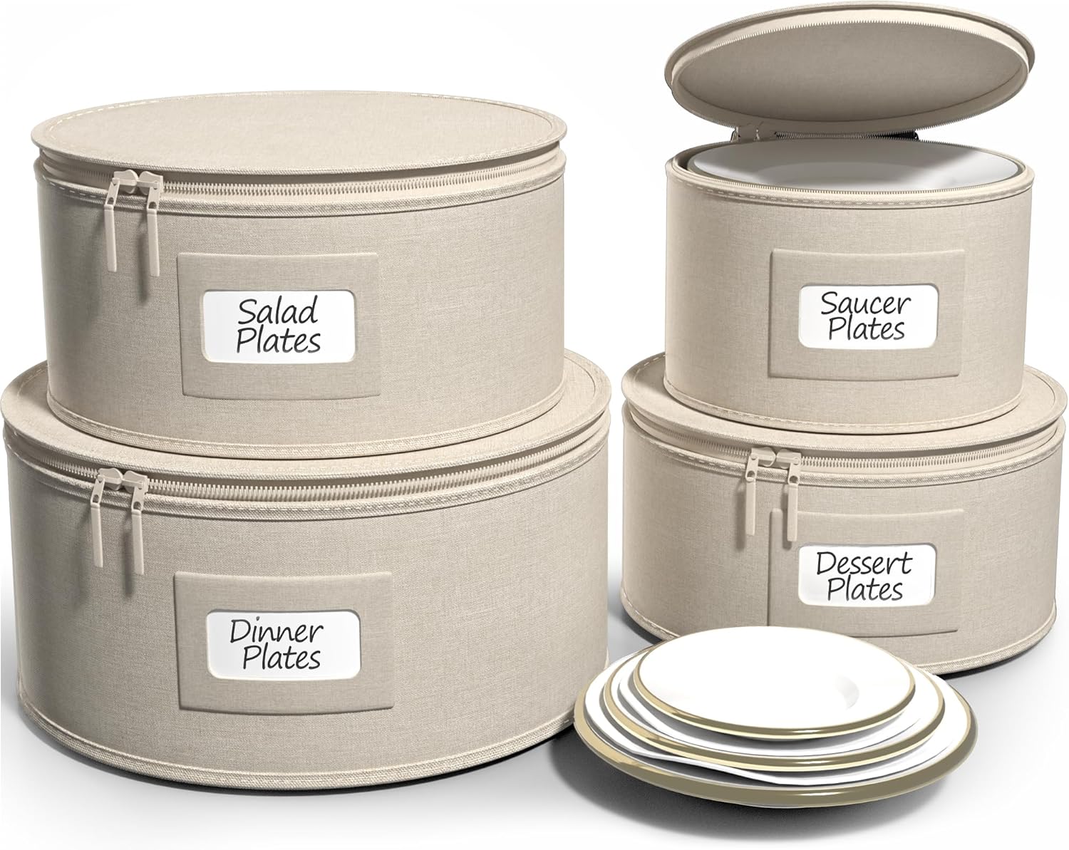 - Sorbus China Dinnerware Storage 4 Piece: Store and organize Christmas dinnerware & accessories and fine china with this quilted 4 Piece china storage case set - Approximate Measurements Round Dinner Plate Case 12” D x7.5” H, Salad Plate Case 9” D x6 ” H, Dessert Plate Case 8.5” D x 5.5” H, Saucer Plate Case 7.25” D x 5.25” H C- Each case includes a content label window to insert your own label to quickly identify contents inside
