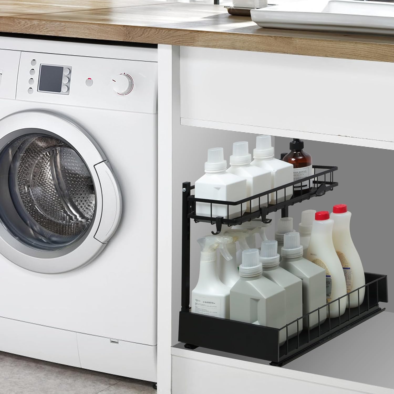 Under Sink Organizer and Storage Shelves With Sliding Drawe, 2 Tier Pull Out Sink Organizers And Storage, Metal Sliding Drawer for Kitchen Bathroom Pantry Cabinet Closet Organization Rack, Black