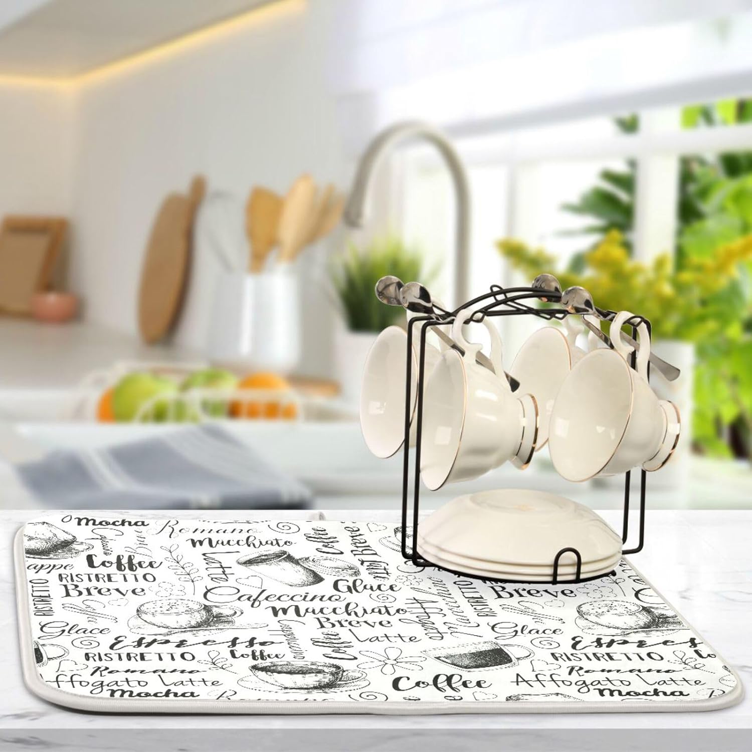Coffee Cups Print Dish Drying Mat for Kitchen Counter Absorbent Microfiber Drying Pad, Large 18x24 in, Reversible Drainer Mats