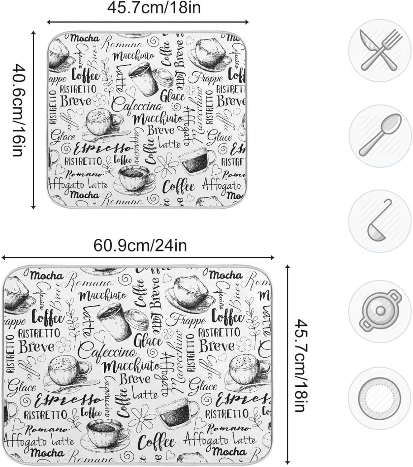 Coffee Cups Print Dish Drying Mat for Kitchen Counter Absorbent Microfiber Drying Pad, Medium 16x18 in, Reversible Drainer Mats