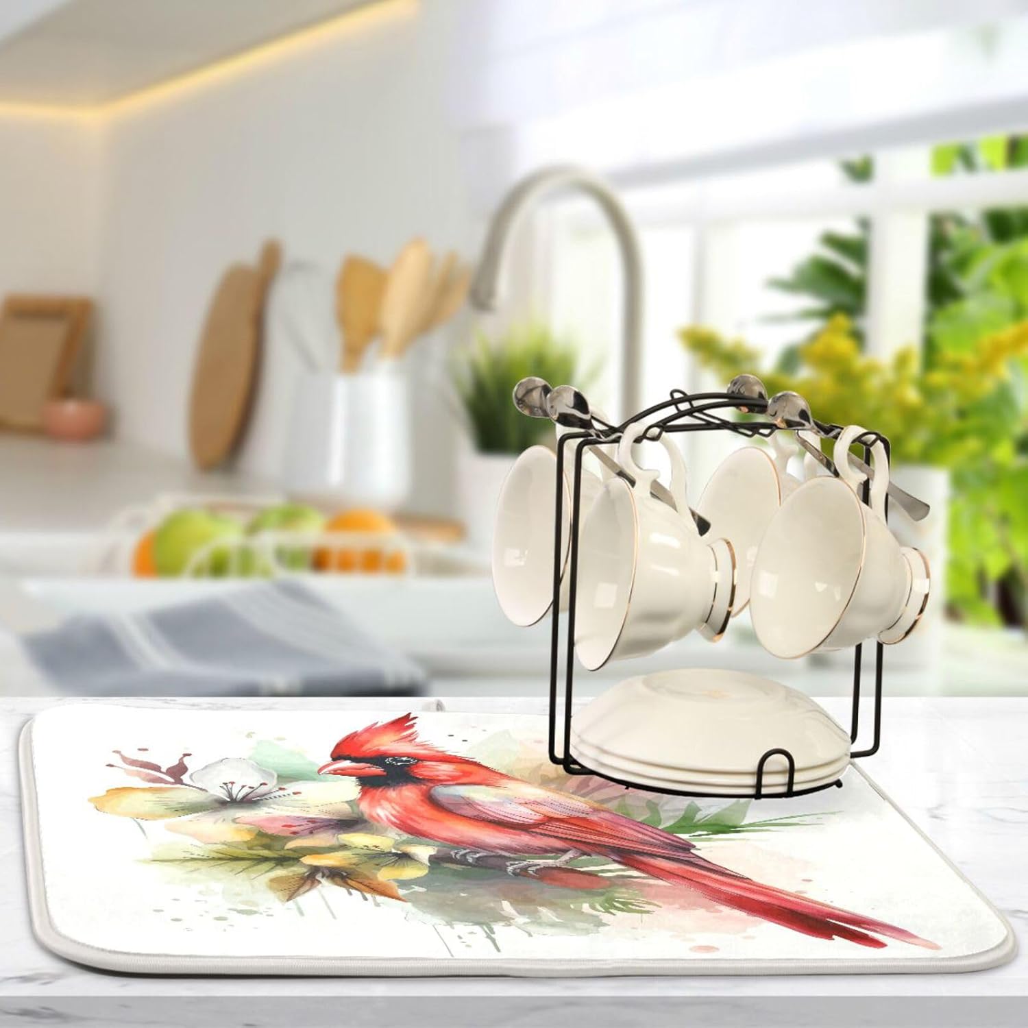 Cute Cardinal Christmas Dish Drying Mat for Kitchen Counter Absorbent Microfiber Drying Pad, Medium 16x18 in, Reversible Drainer Mats
