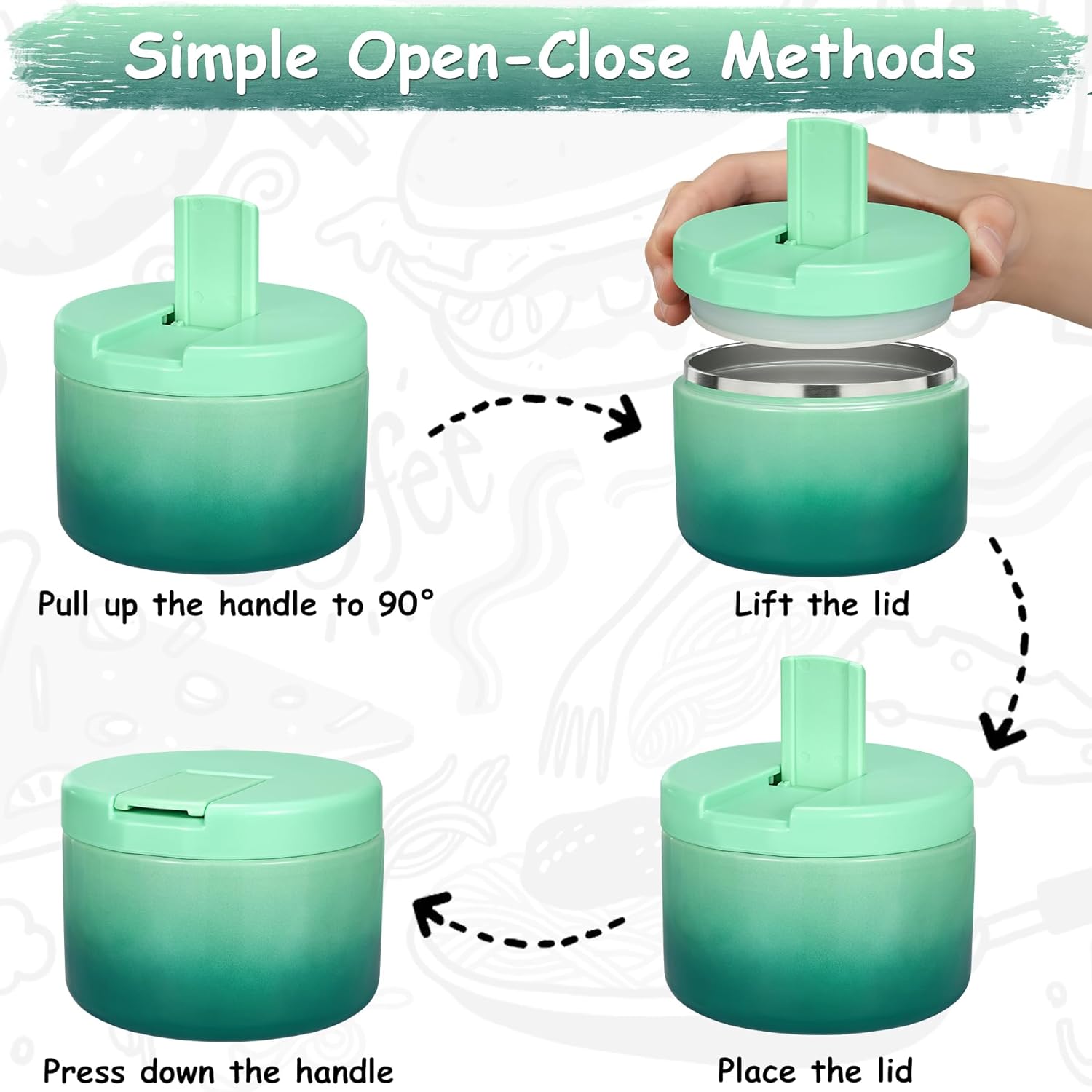 - Use Tips and Notes: In order to keep food hot or cold for a longer time, we recommend preheating/precooling with hot water/ice water for 5~10 minutes before putting food or soup into the food jar, and then put the food in. Note that when you disassemble the cover for cleaning and then reinstall it, be sure to lift the top of the cover before installing it. Otherwise, it will not be firm!!!