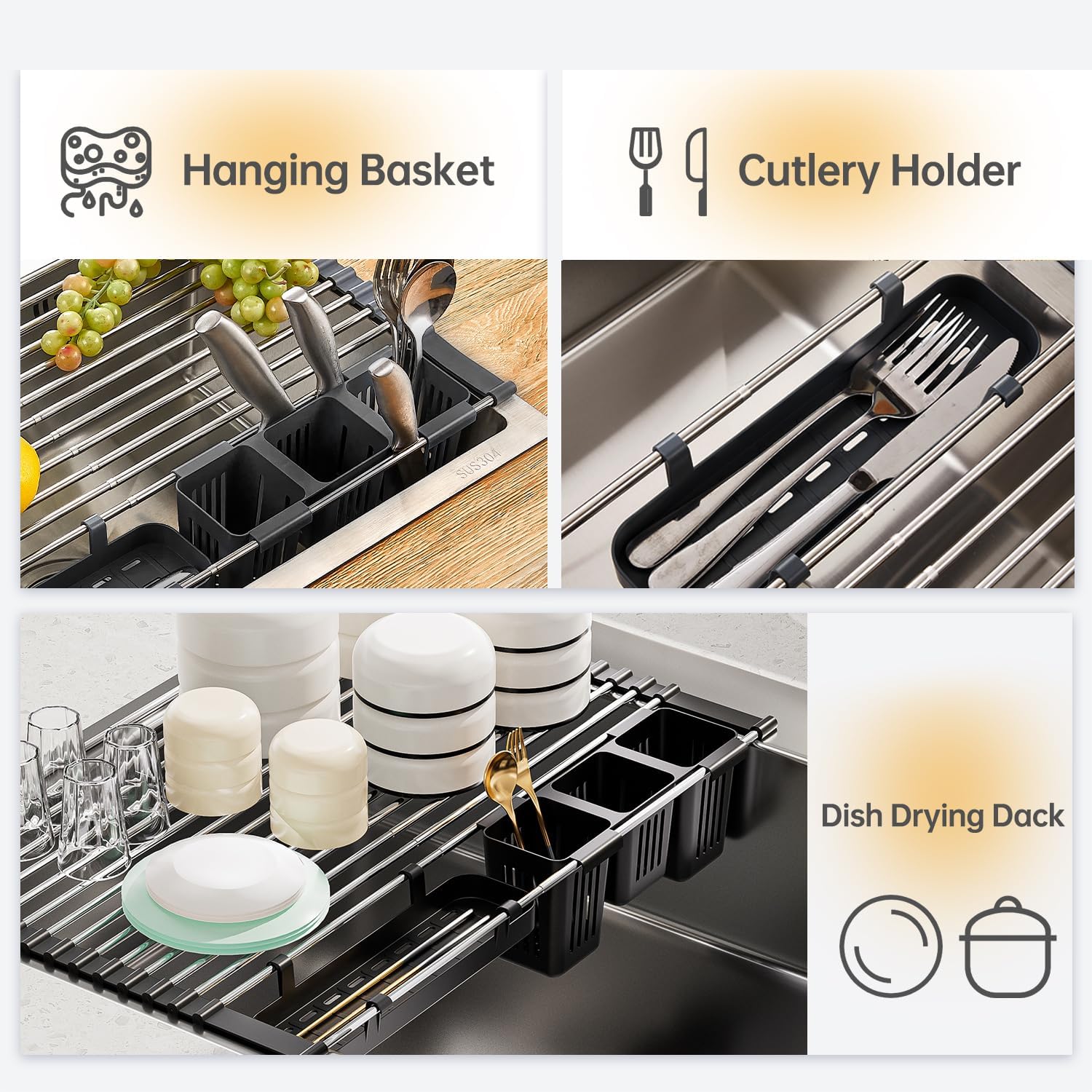 Expandable Over Sink Dish Drying Rack, Large Roll Up Dish Drying Rack with 2 Storage Baskets, Rolling Drain Mats for Kitchen Sink Counter, BPA-Free(12-22 * 15.3'', Black)