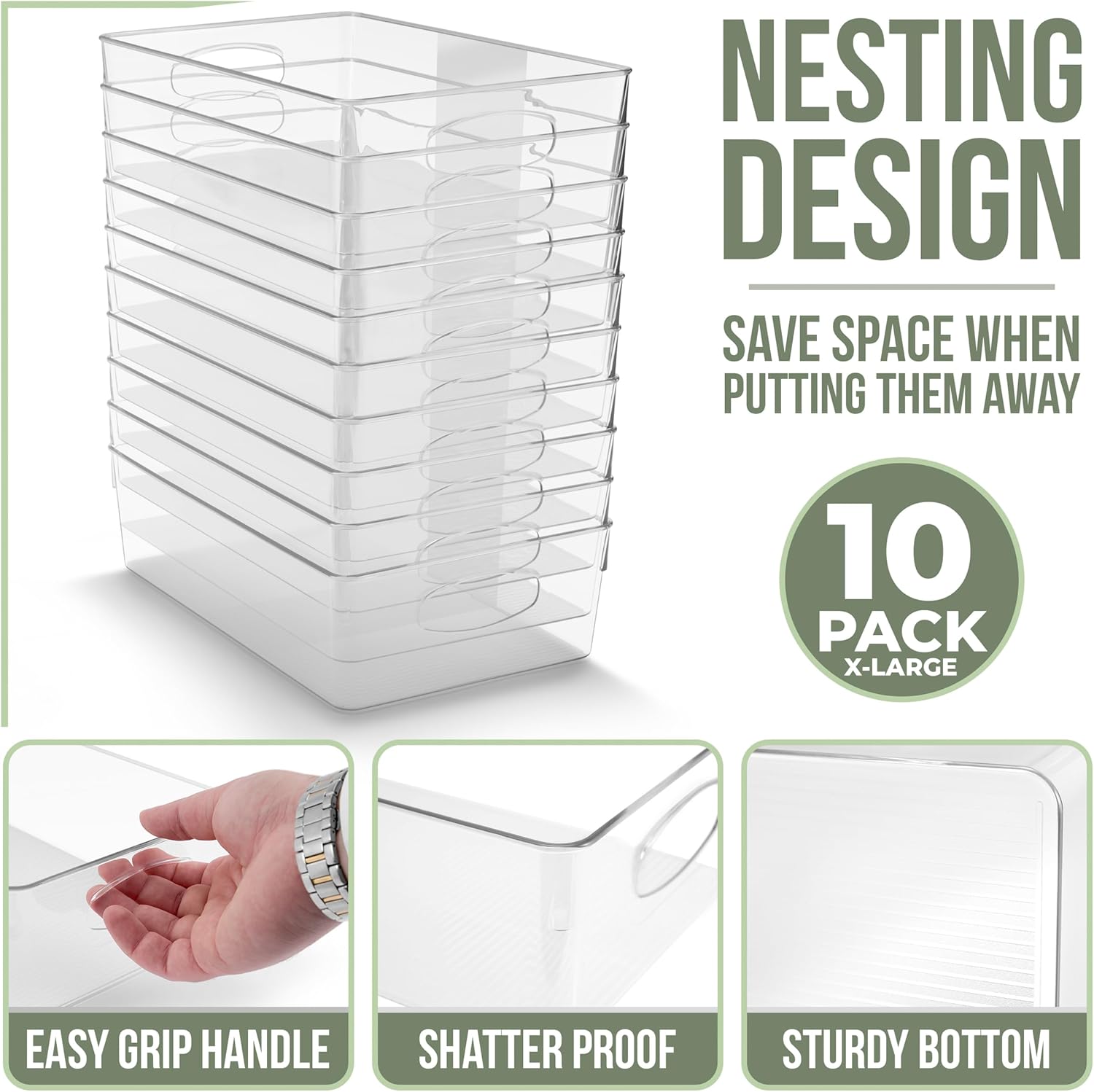 - Set Includes and Dimensions: This set includes 10 X-Large clear plastic storage bins, each measuring 11.75 x 7.5 x 3.25 inches. Perfect for maximum storage needs, these bins are ideal for organizing bulk pantry items, large snacks, fruits, and vegetables