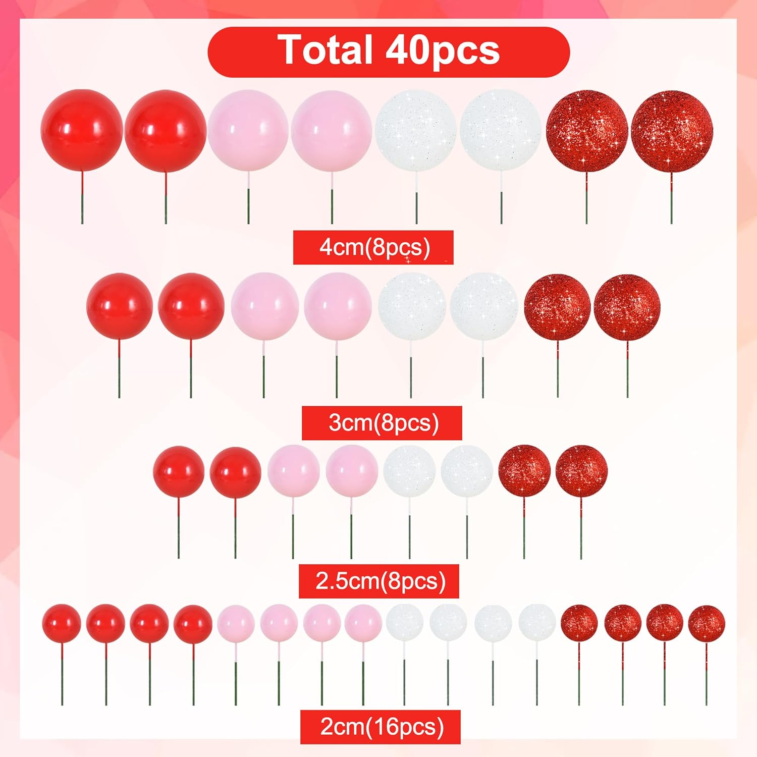 BEISHIDA 40 Pcs Foam Ball Cake Toppers with Sticks Mini Ball Cake Decorations for Birthdays, Weddings, Valentines, DIY Baking Supplies, Anniversary Party (Red, Pink, White)