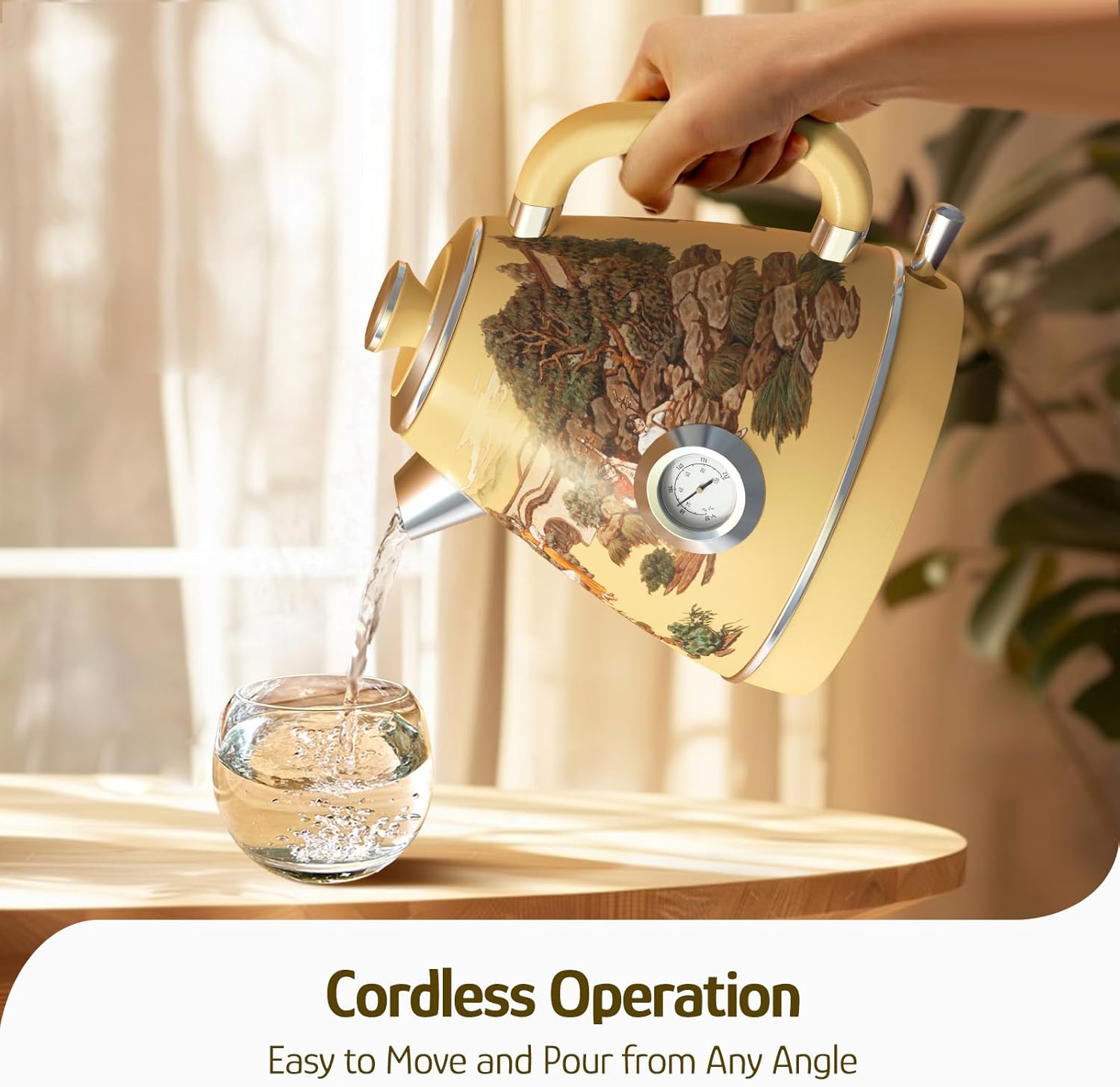 Hazel Quinn Retro Electric Kettle - 1.7 Liters / 57.5 Ounces Tea Kettle with Thermometer, All Stainless Steel, 1200 Watts Fast Boiling, BPA-free, Cordless, Automatic Shut Off - Garden Scenery