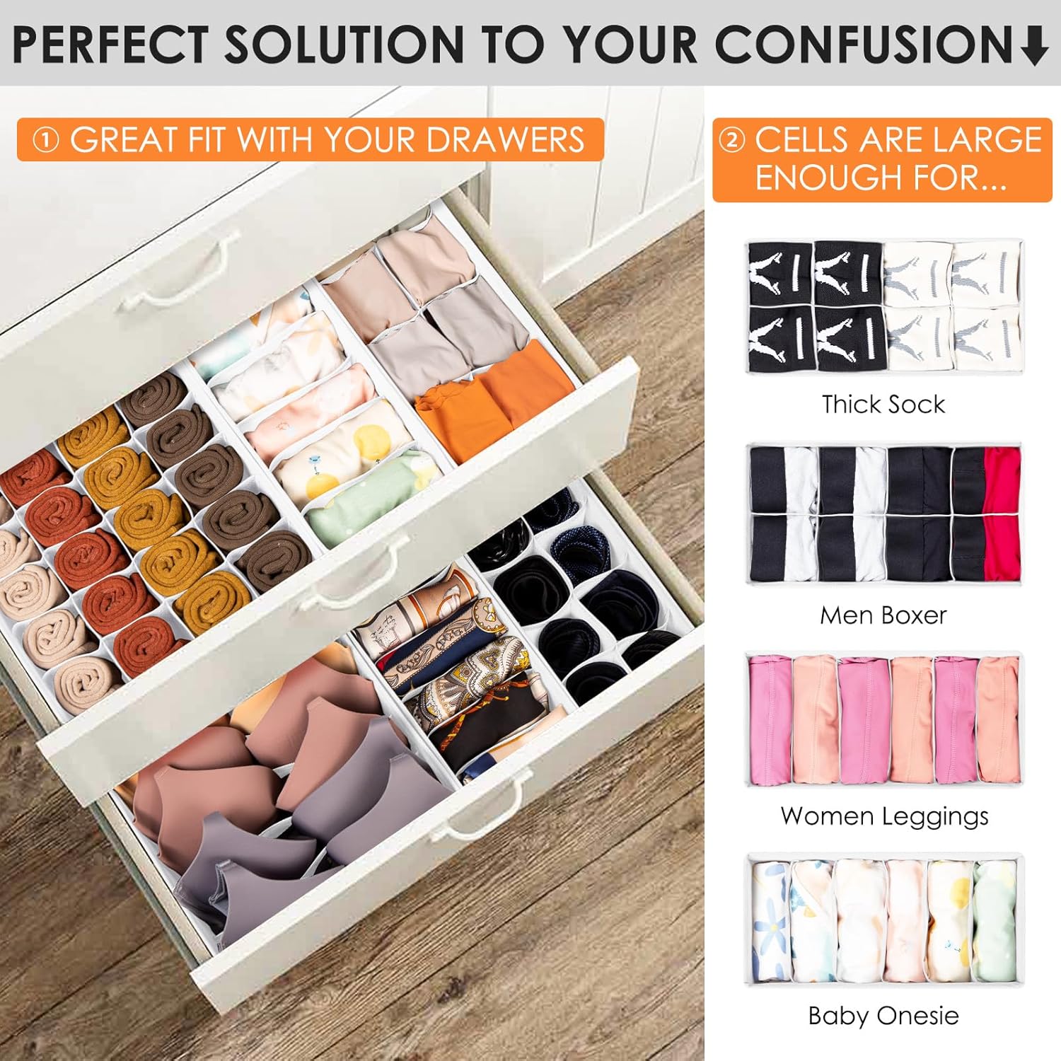 - 【COMPARTMENTS FOR MULTI STORAGE USE】Compared to others, our 8 pack drawer organizer set has 5 sizes for various storage needs. No matter it's knee sock, men boxer brief, or women leggings, they will all perfectly fit into our clothes organizer. Great for bedroom organization and dorm room storage.