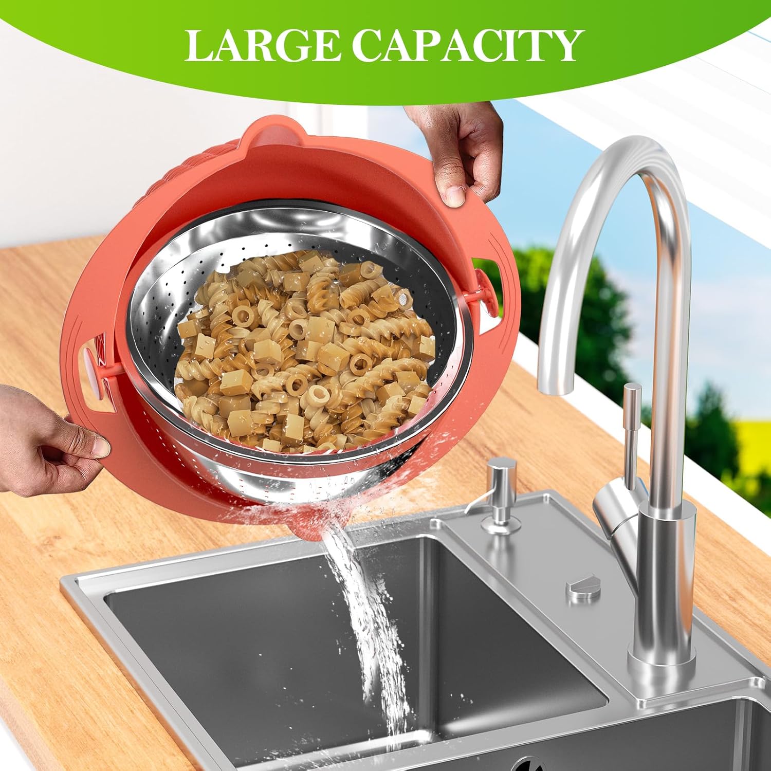 - Ergonomics in Details : The handle of the strainer bowl is large, sturdy, and easy to grip. The non-slip base and unique shape keep the bowl steady when beating on the counter or carrying it on the go. The density and right size of holes make draining fast and food won't fall. The open mouth on the pasta strainer makes water pouring fast.