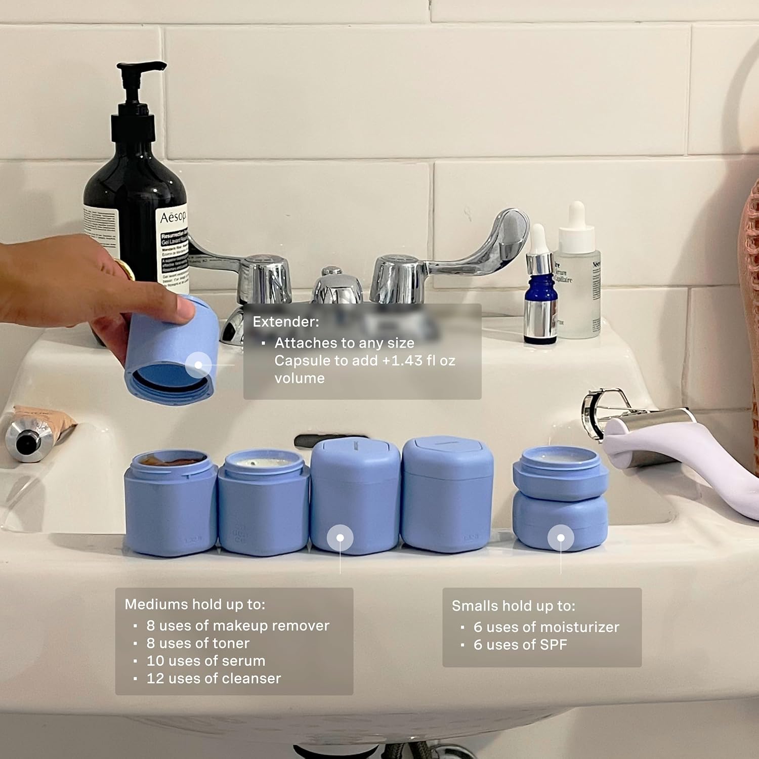 Cadence Travel Containers - Full Skincare Set - Magnetic Containers with Lids,Carry On Travel Essentials For Women/Men - 2 Small (0.56oz), 4 Medium Capsules (1.32oz), & Extender (1.43oz) - Pacific