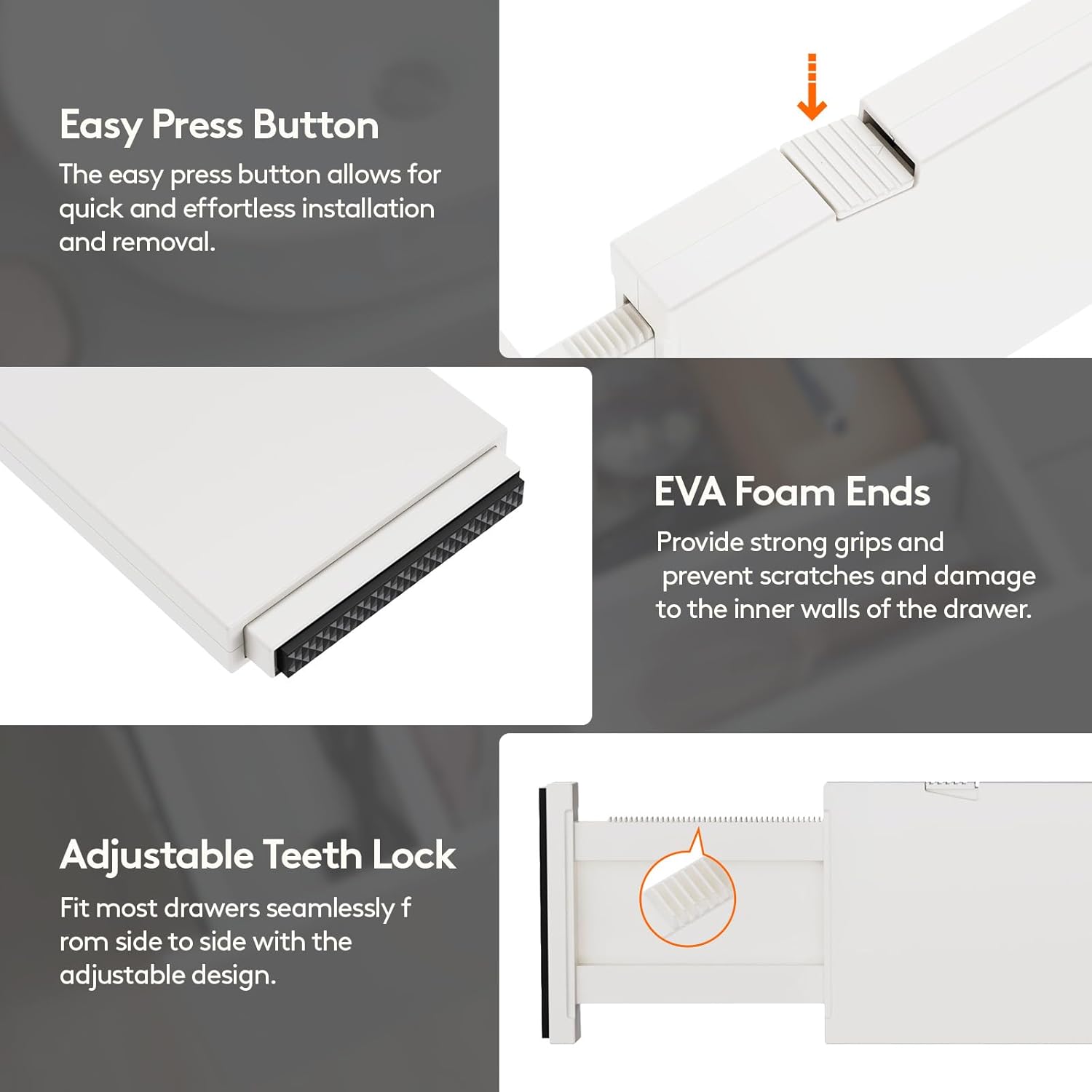 - Premium Material: Our drawer organizers for clothing are made of sturdy ABS material and include high-quality EVA foam sponges on both ends to prevent any scratches or damage to your drawer’s inner walls, leaving no trace or residue behind