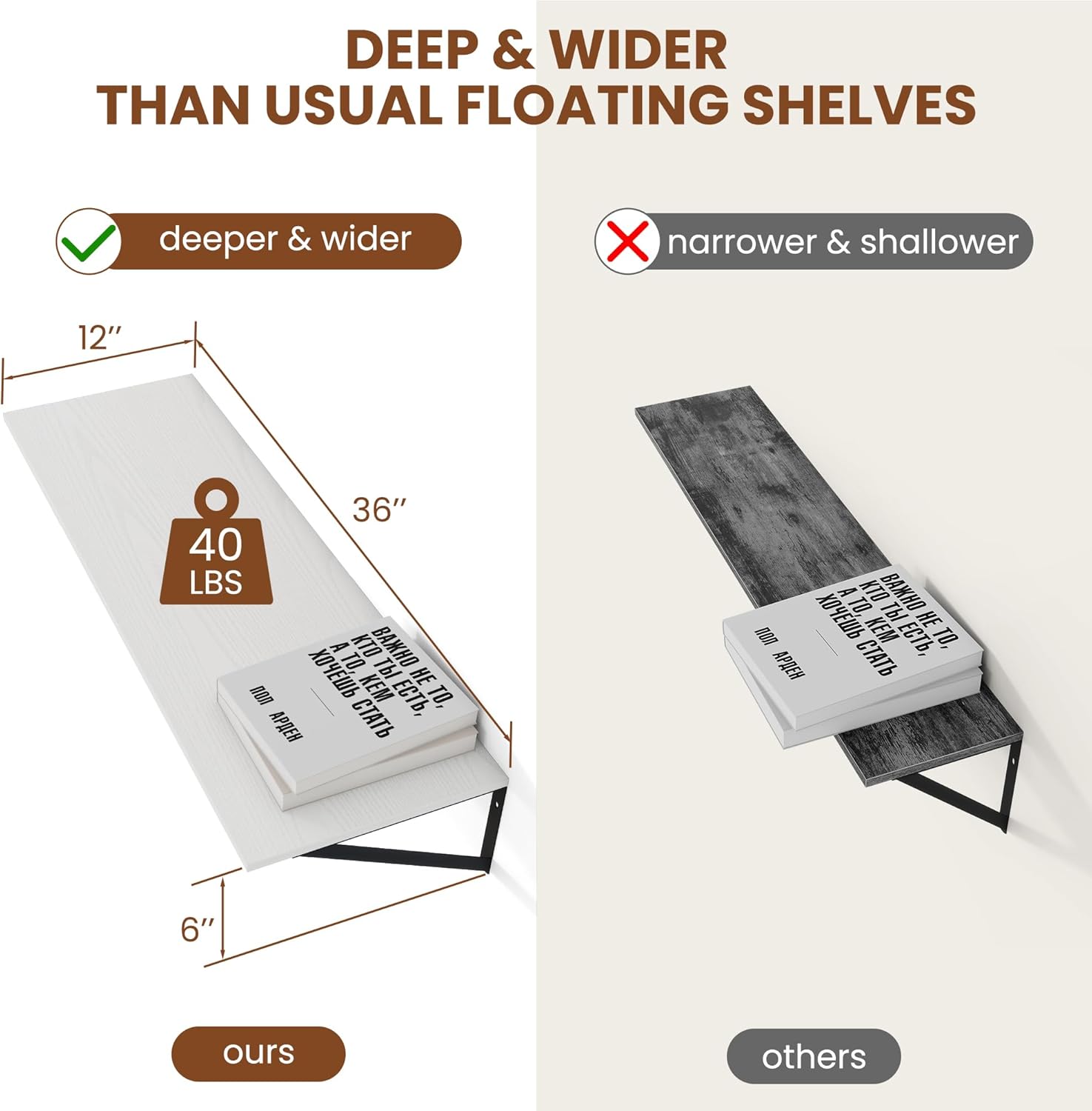 - [Size Does Matter] - These wall shelves are wider and longer than regular shelves on the market, providing more room and worry-free storage! Measures: 36Wx12Dx5.8H Easy to install within a few minutes with all necessary hardware included.