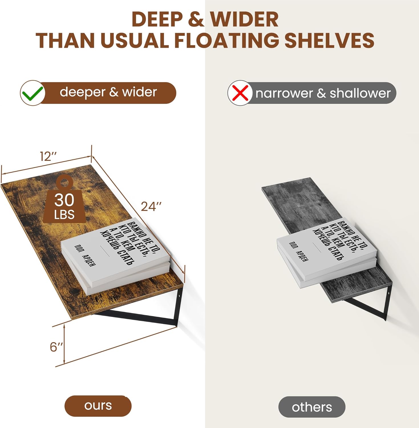 Heimlove Deep Floating Shelves for Wall, 24W x 12D Wood Wall Shelves Set of 2, Wide Floating Bookshelf for Living Room, Kitchen, Office, Bedroom and Decor Storage, with Metal Bracket - Rustic Brown